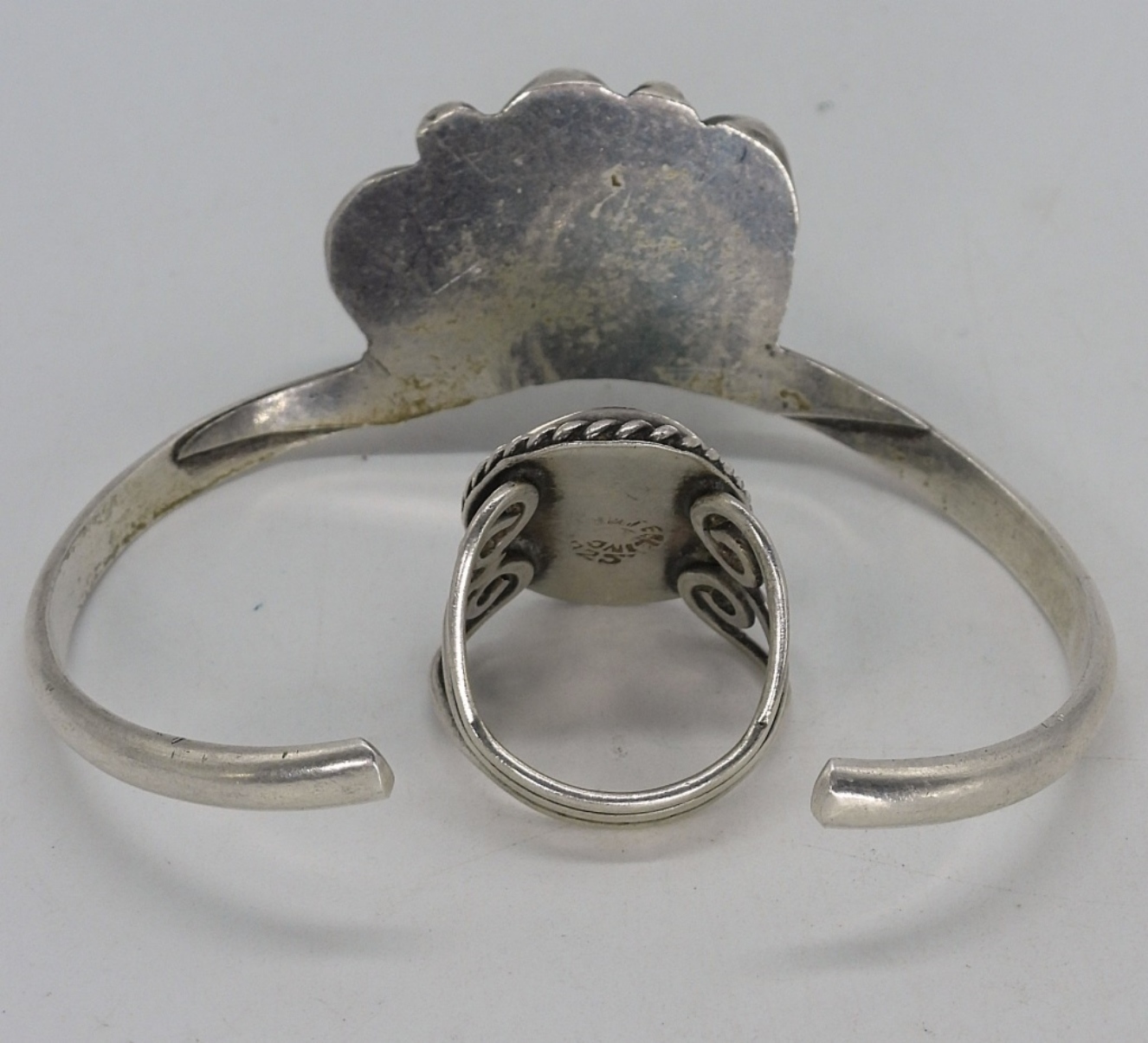 Native American sterling Green Turquoise cuff bracelet, no markings. Mexico sterling Green Turquoise ring, size 5.5 (13 dwt)