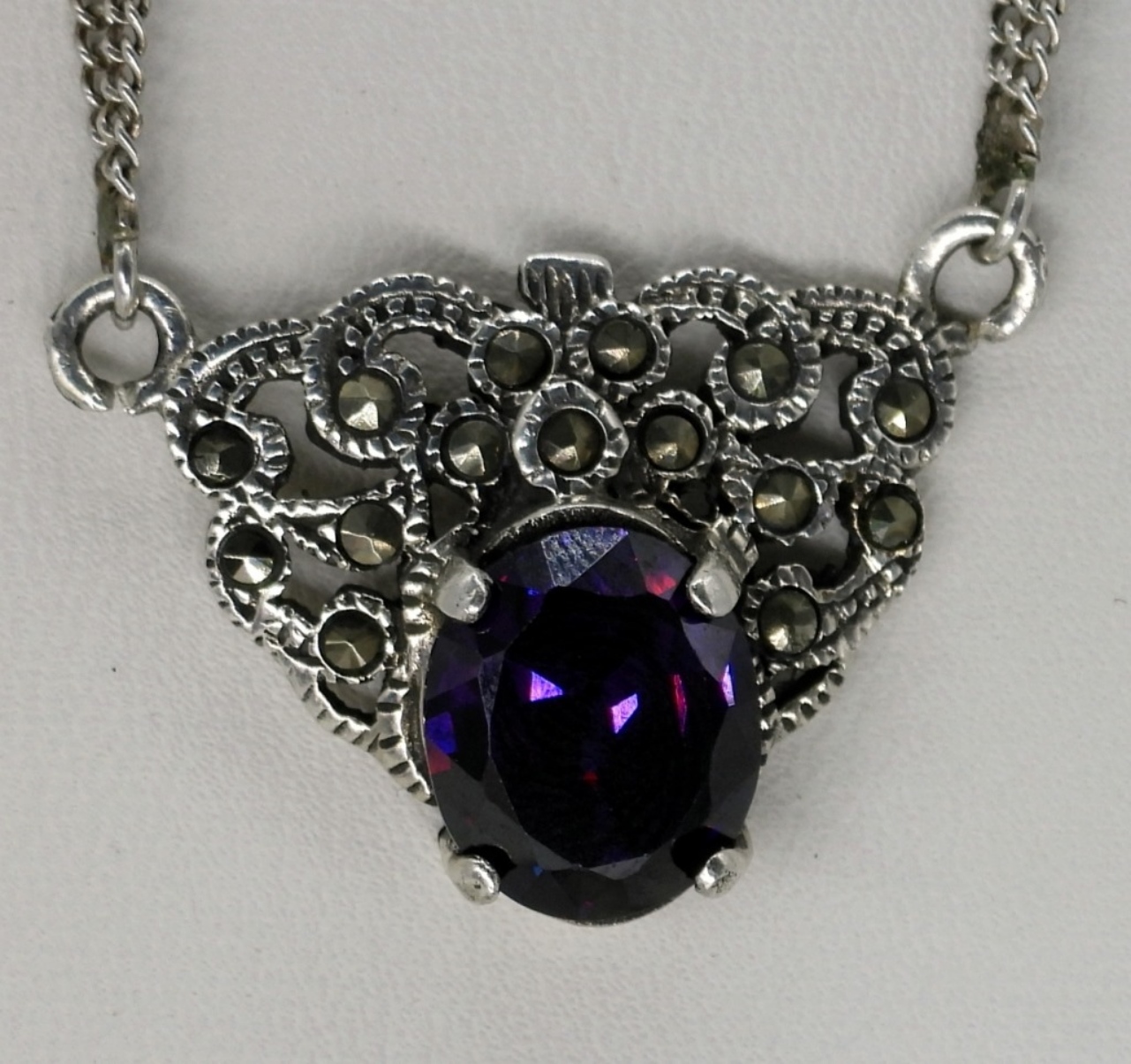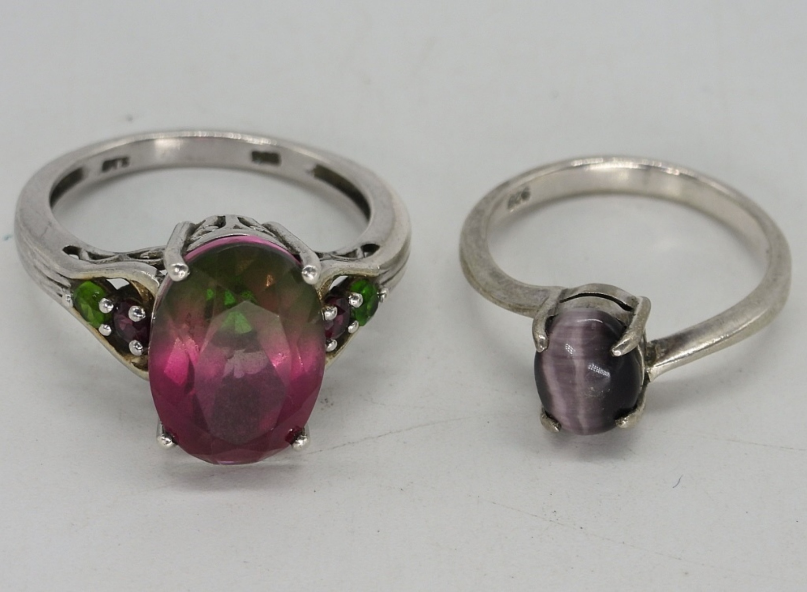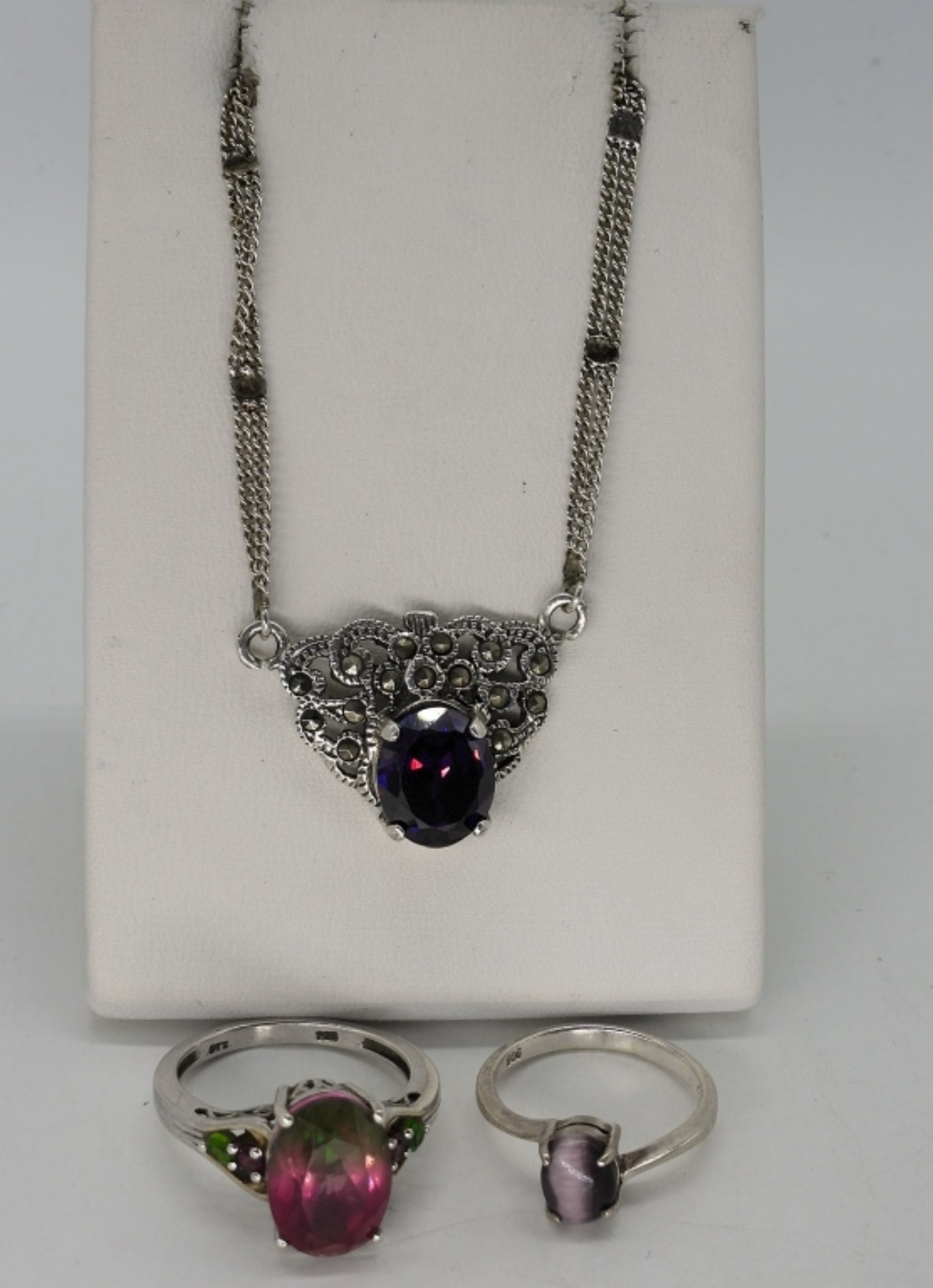 Sterling Amethyst necklace, 24″ long. Purple cats eye ring, size 6 3/4. Watermelon Tourmaline sterling ring, size 9. (12 dwt)