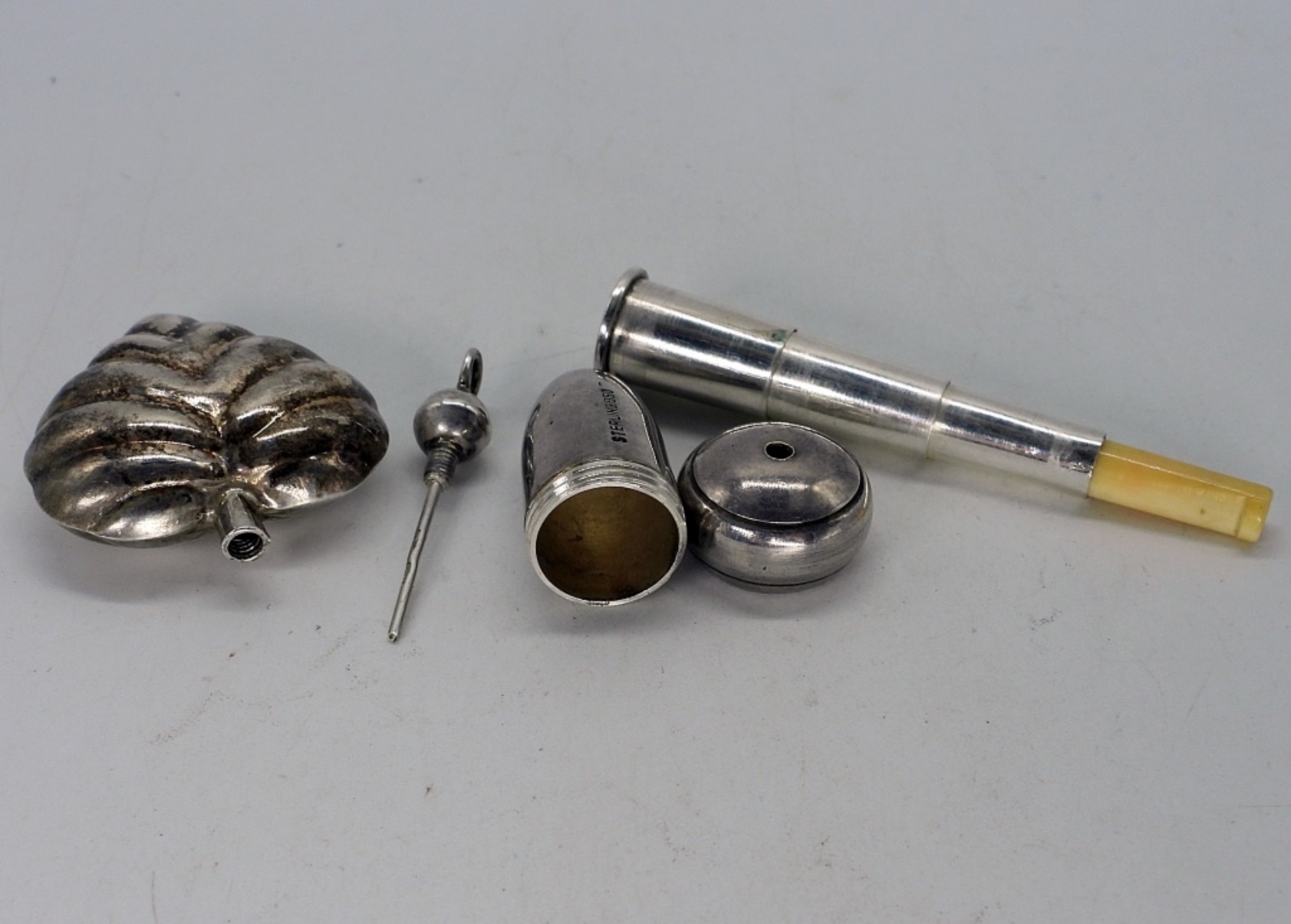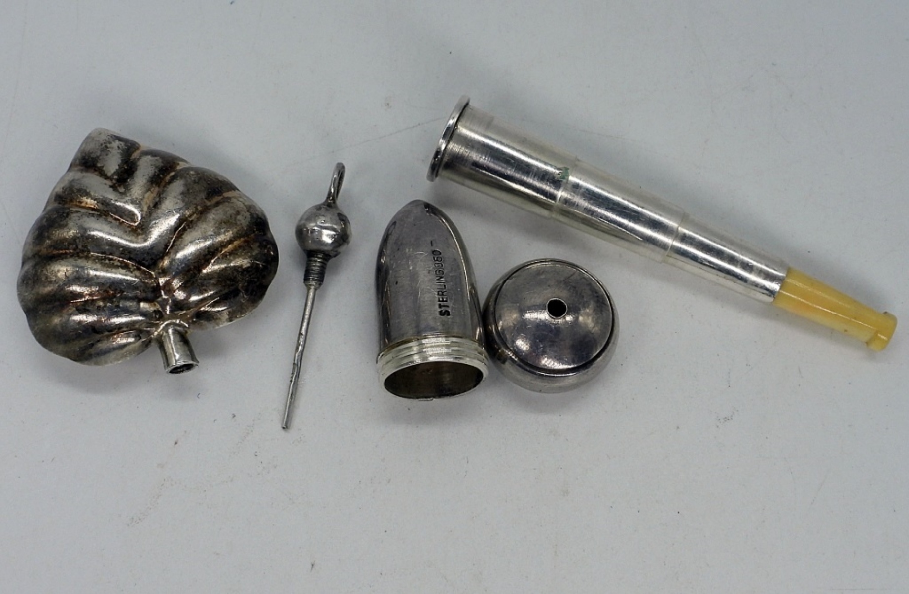 Telescopic, collapsable, portable vintage sterling cigarette holder. Telescopes to 2.5″ long. Heart shaped sterling perfume pendant, 1.5″ long. (10 dwt)