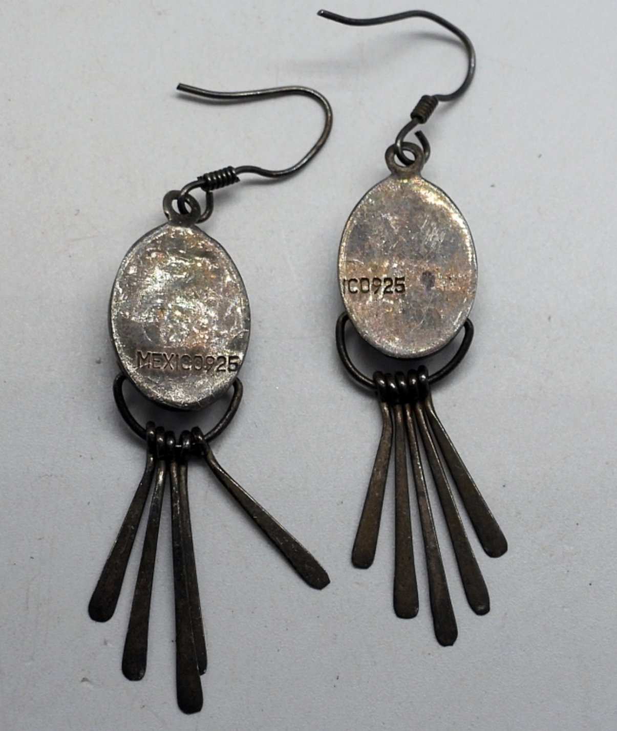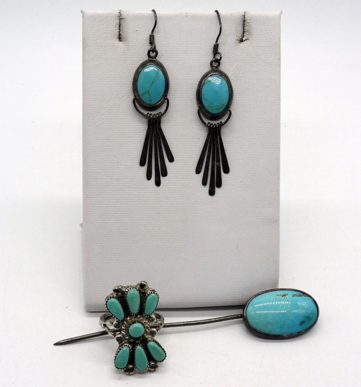 Light blue Turquoise gemstones in vintage sterling. Pierced earrings hang 2″ long. Ring is size 5. Stick pin is 3″ long and slightly bent. See Photos. (8 dwt)