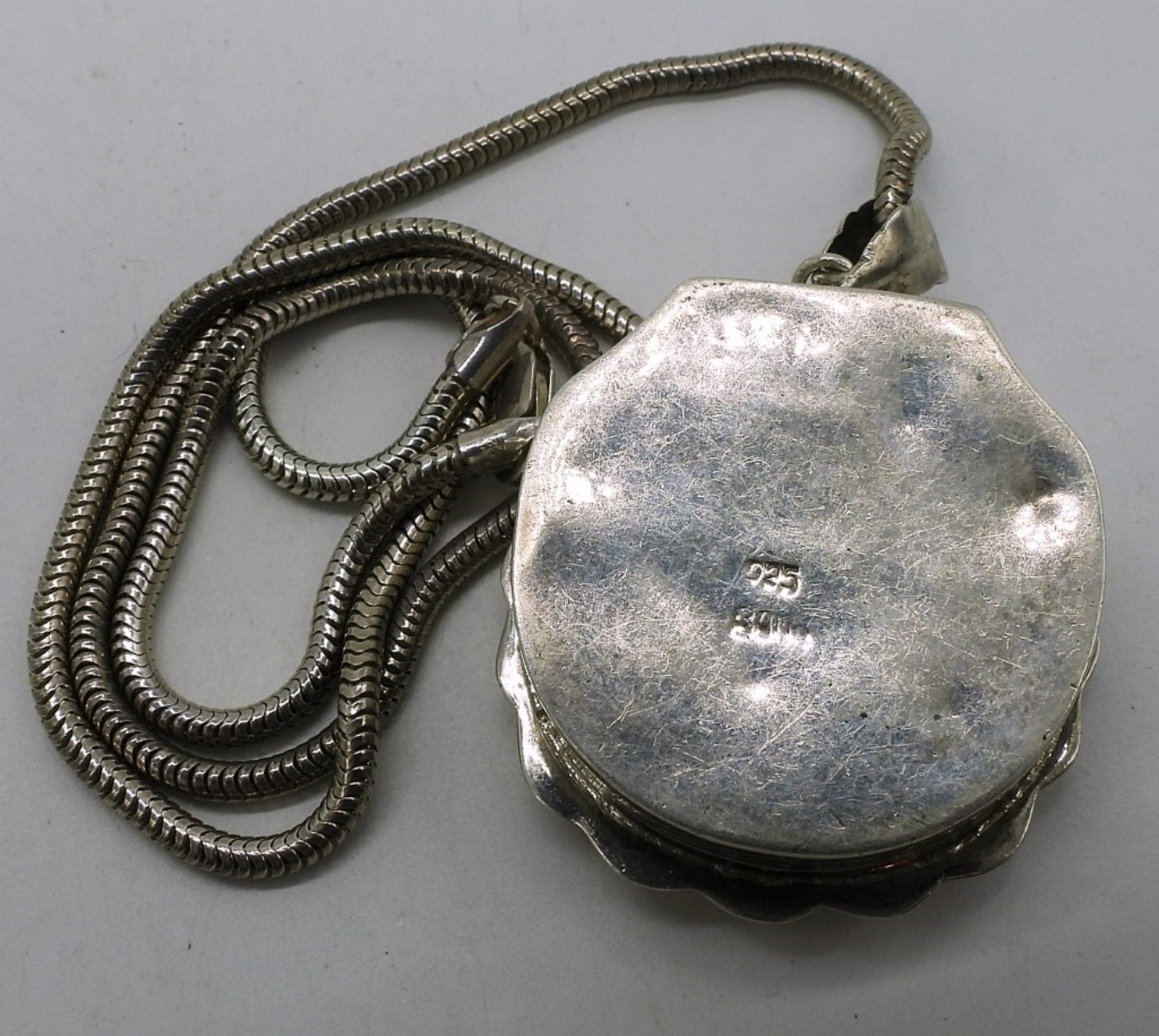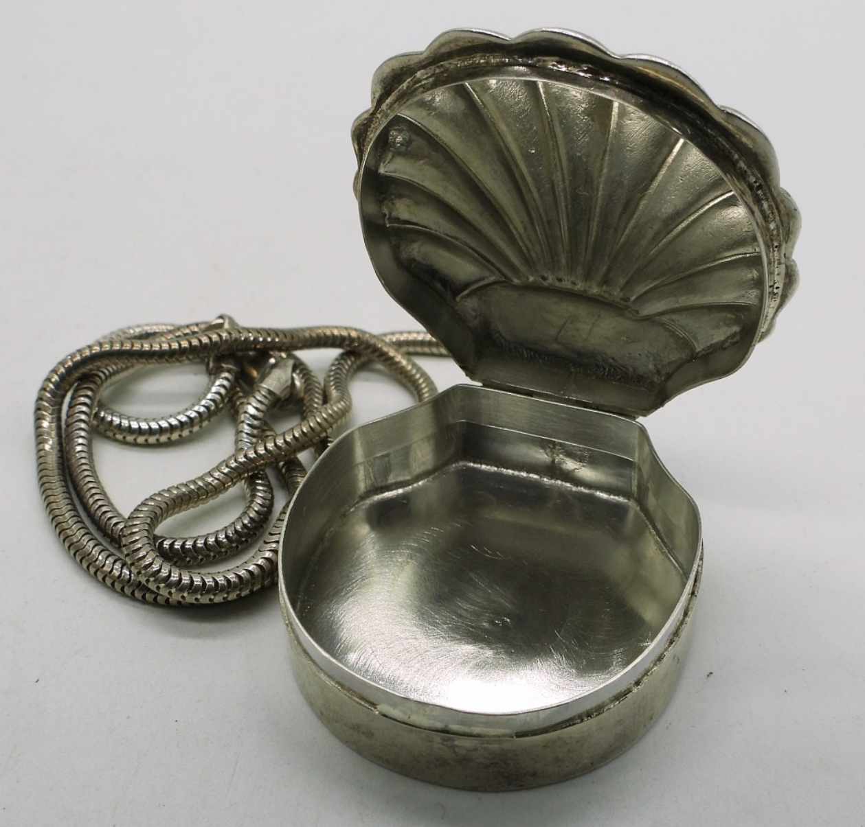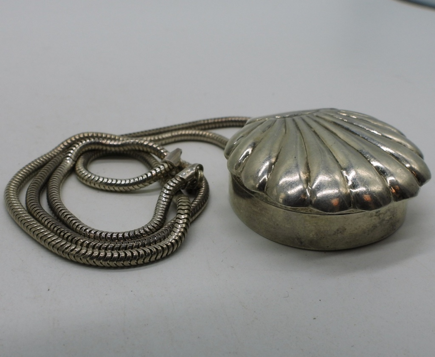 Vintage shell shaped pill box pendant, with a 18″ sterling chain. Pendant measures 2″ long x 1.5″ wide. (15.6 dwt)