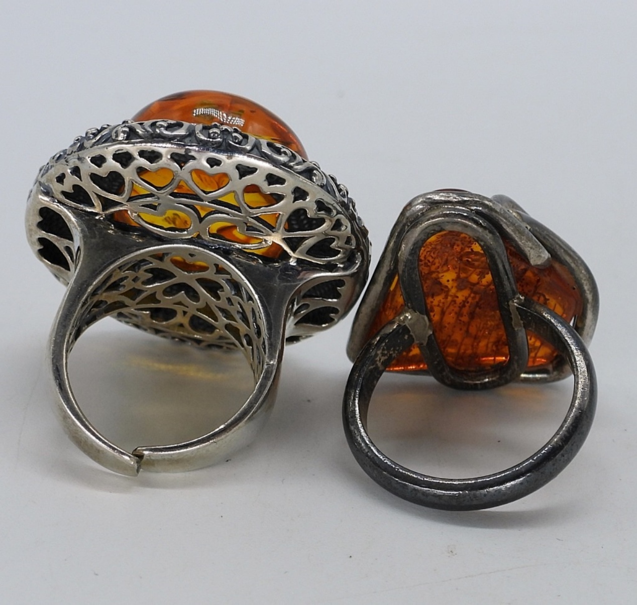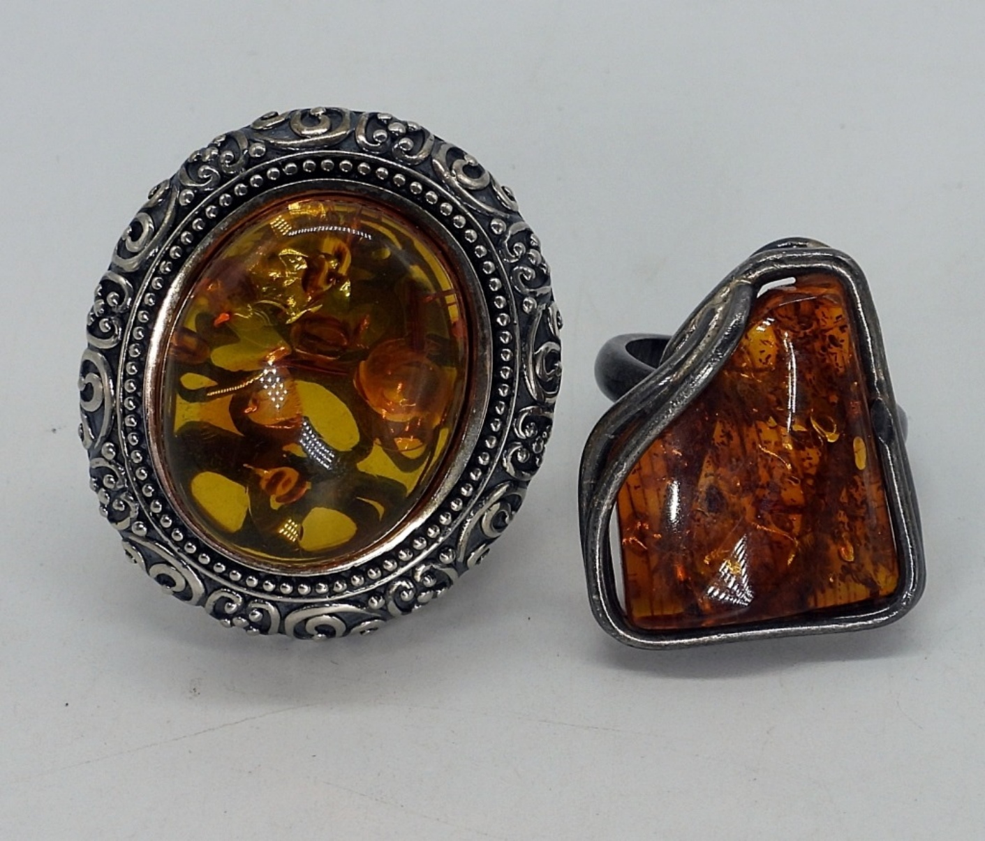 Two sterling rings with large Amber gemstones. One ring is resizable and the other is size 9. Tops of the rings measure 1″ – 1.5″. (16 dwt)