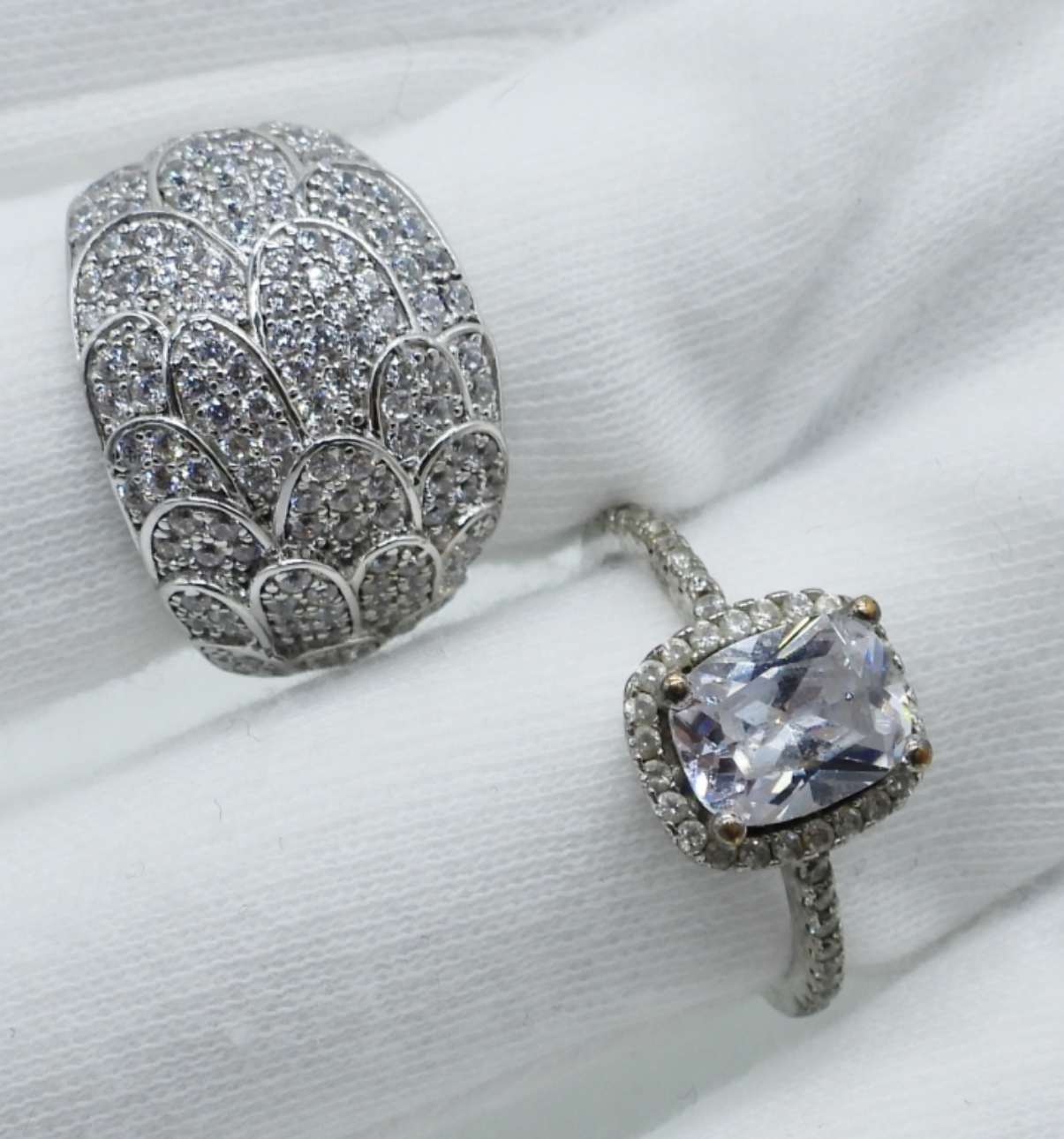 Simulated diamond sterling rings, necklace and pierced earrings. Rings are size 7 & 8. Earrings hang 1″. Necklace is 18″ long. (11 dwt)