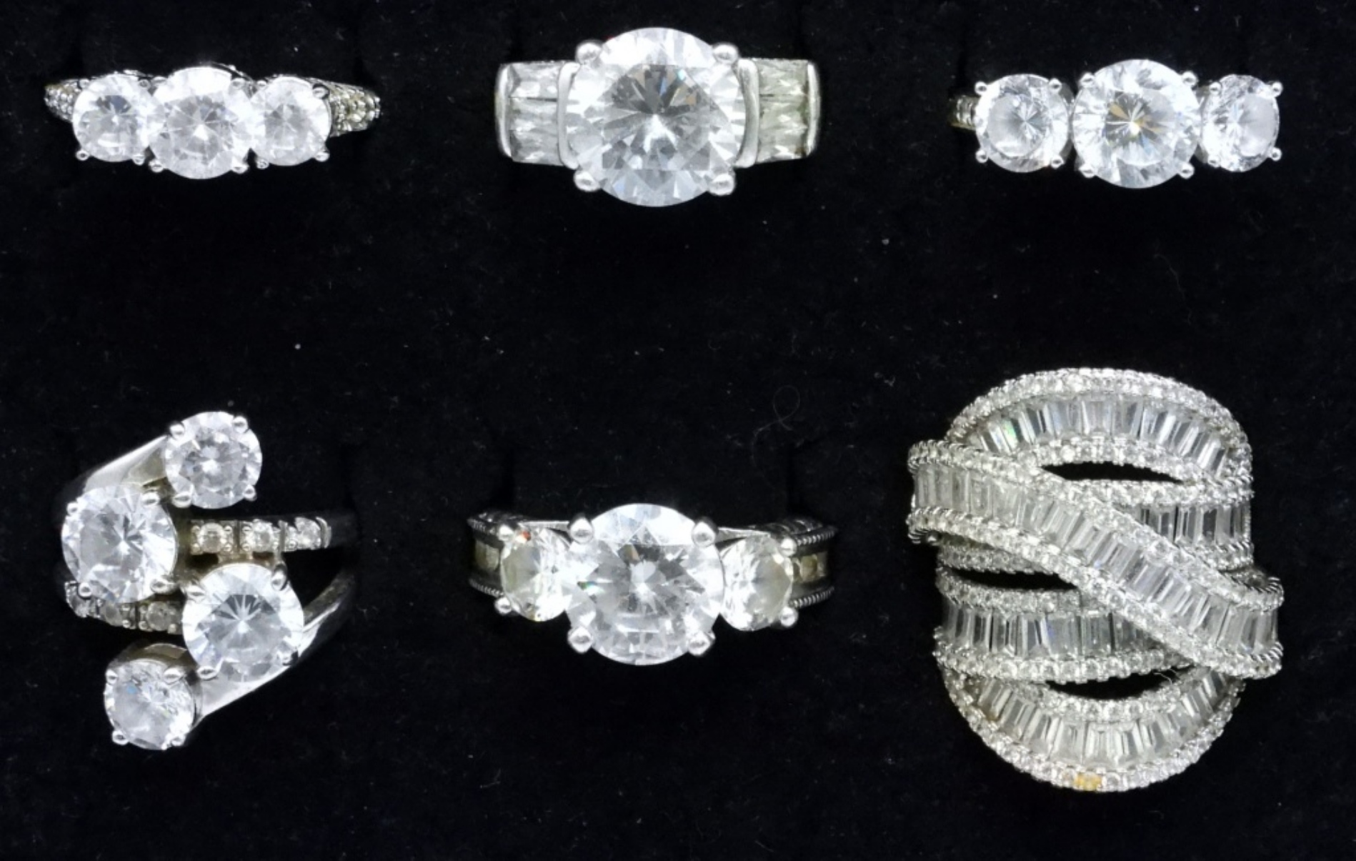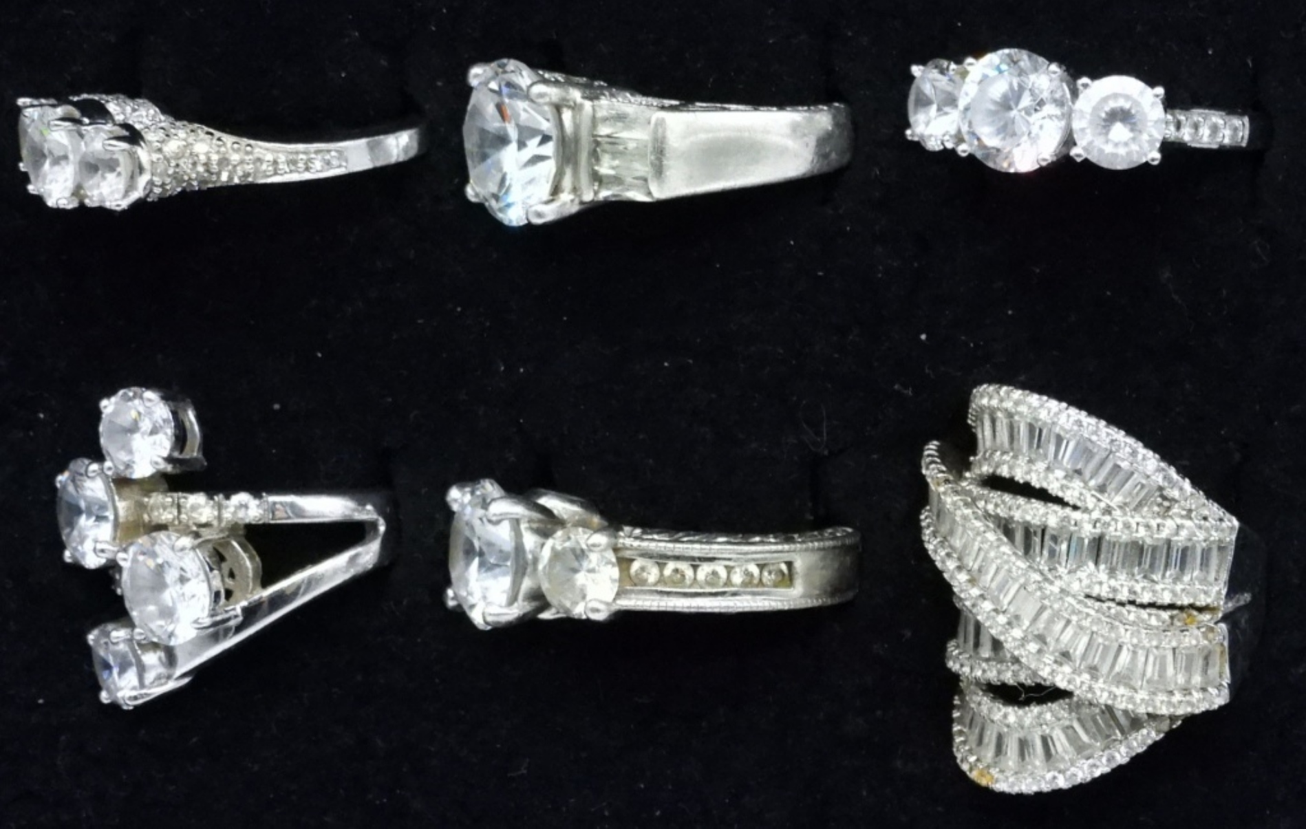Six sterling bridal style rings with large simulated diamond gemstones. Ring sizes are 6-8. (27 dwt)