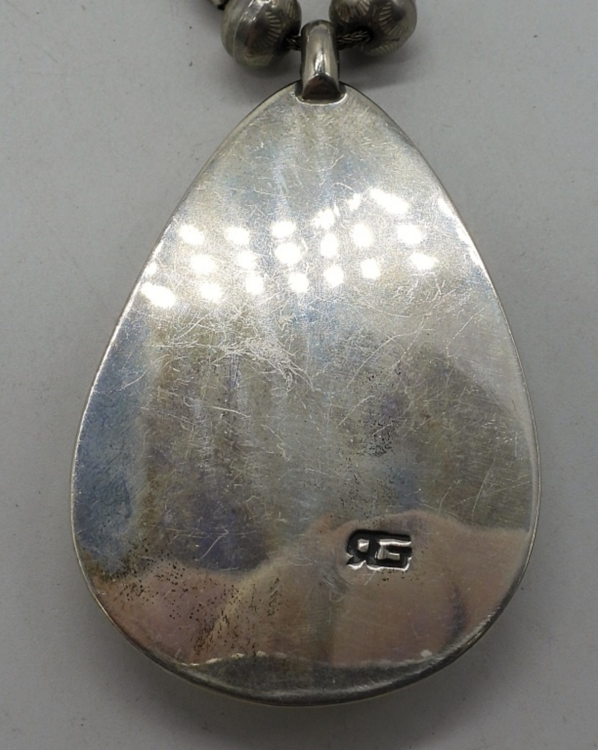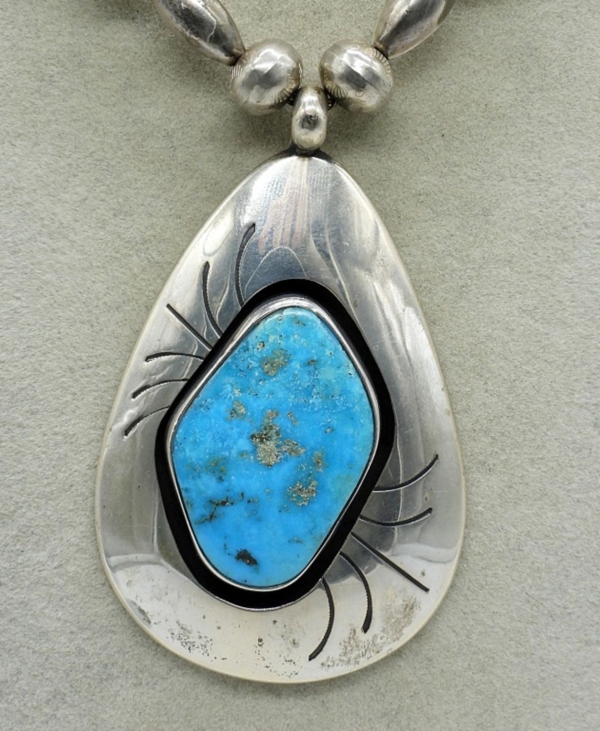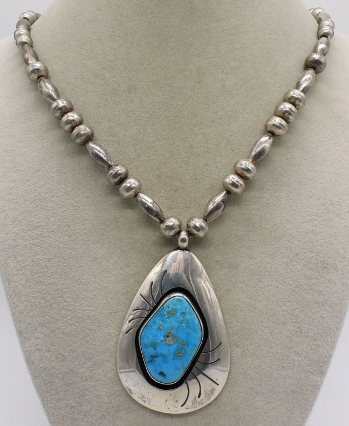 Native American sterling necklace with large Turquoise chunk. Pendant measures 2.5″ long. Sterling chain is 22″ long. See photos for stamp. (25.6 dwt)