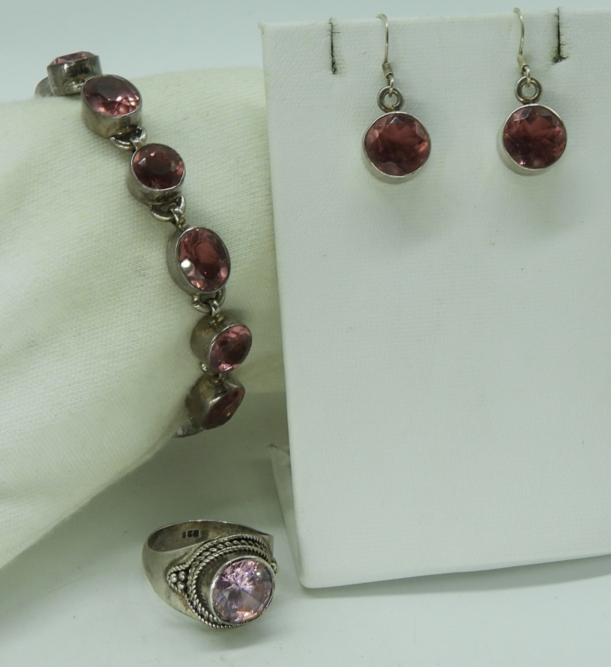 Three piece sterling pink gemstone set. Pierced earrings, 1″ long. Adjustable 6.5-8″ bracelet. Ring size 8.5 (17 dwt)