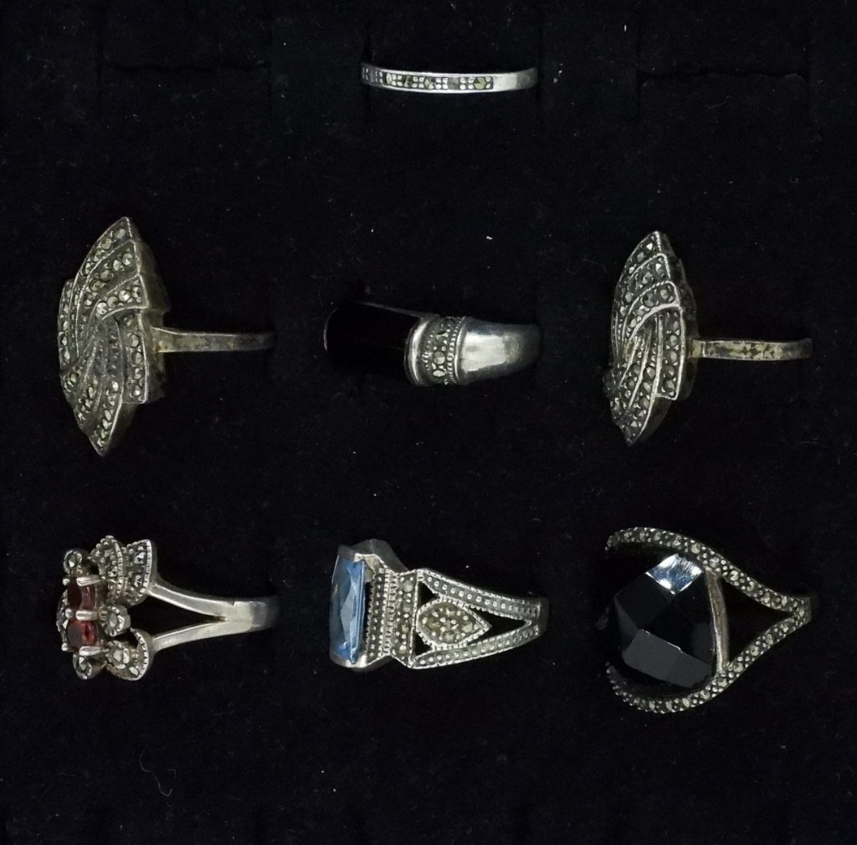 Seven sterling rings with marcasite, blue topaz, garnet & black onyx. Sizes 6-9 (21 dwt) (6x4x2)