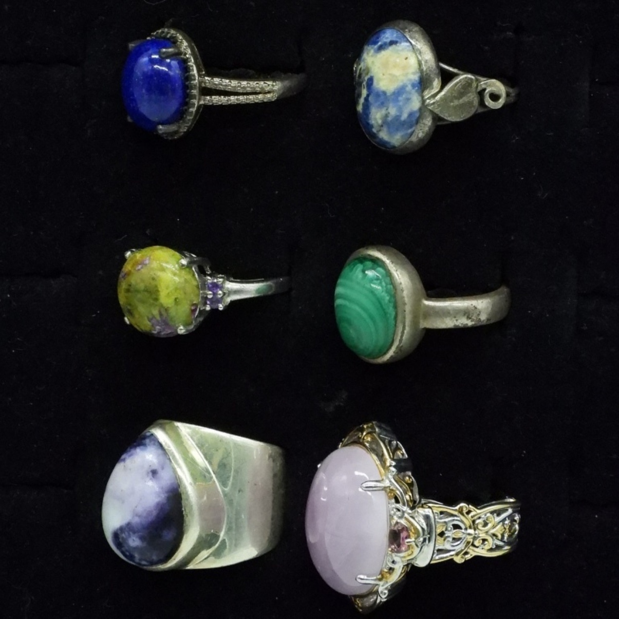 Six sterling natural gemstone fashion rings. Sizes 5-9. Malachite, Atlantisite, Sodalite, Rose Quartz and more. (26 dwt) (6x4x2)