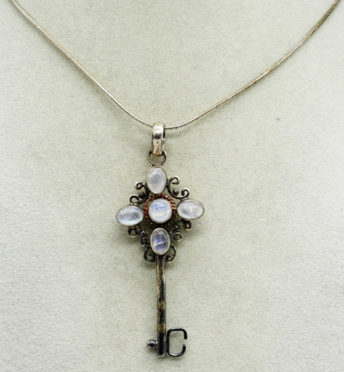 Moonstone gemstone key necklace. Pendant is 3″ long and chain is 24″ long. Two moonstone rings, size 7. (14 dwt)