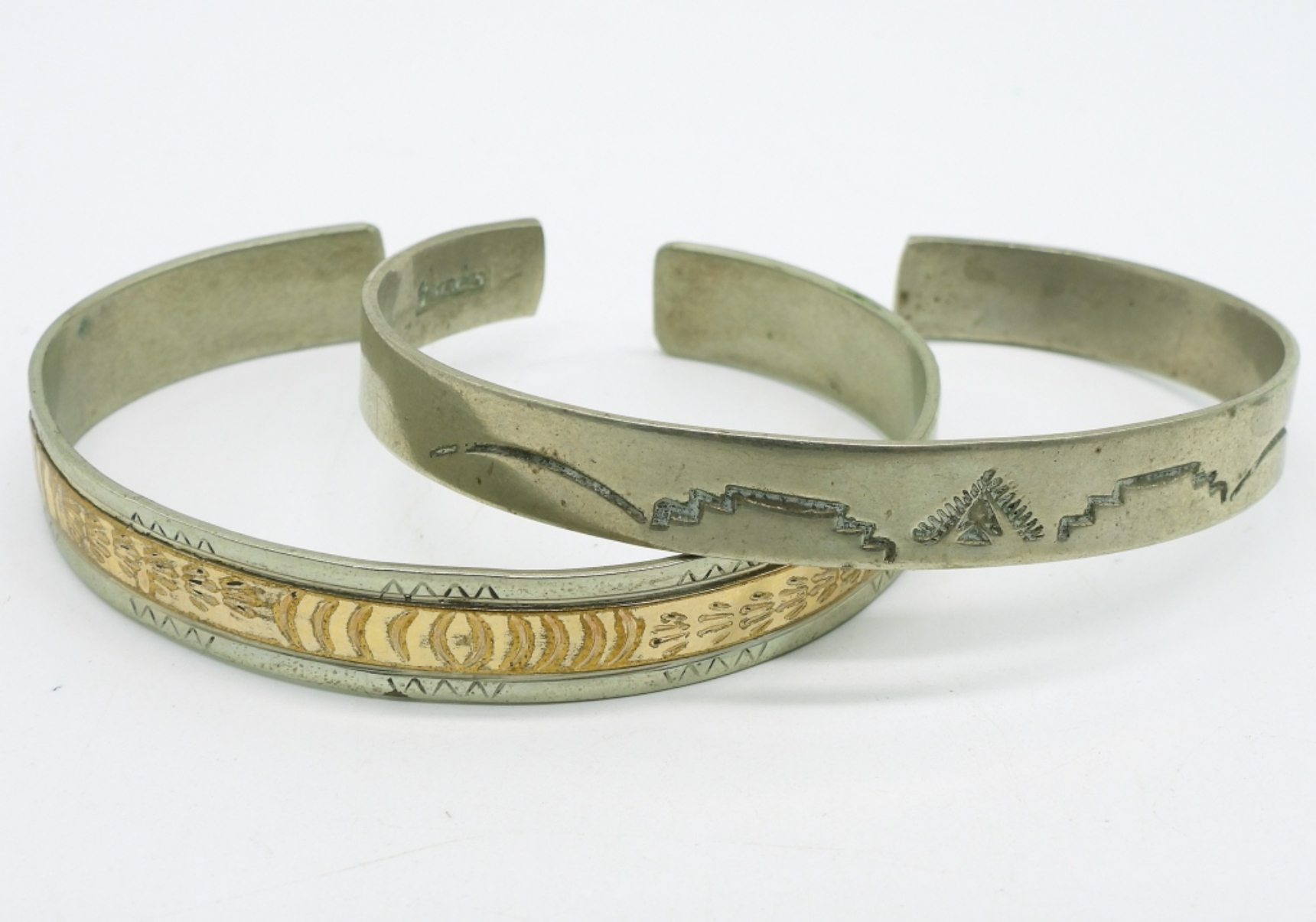 Two sterling cuff bracelets with etched designs. (19 dwt)