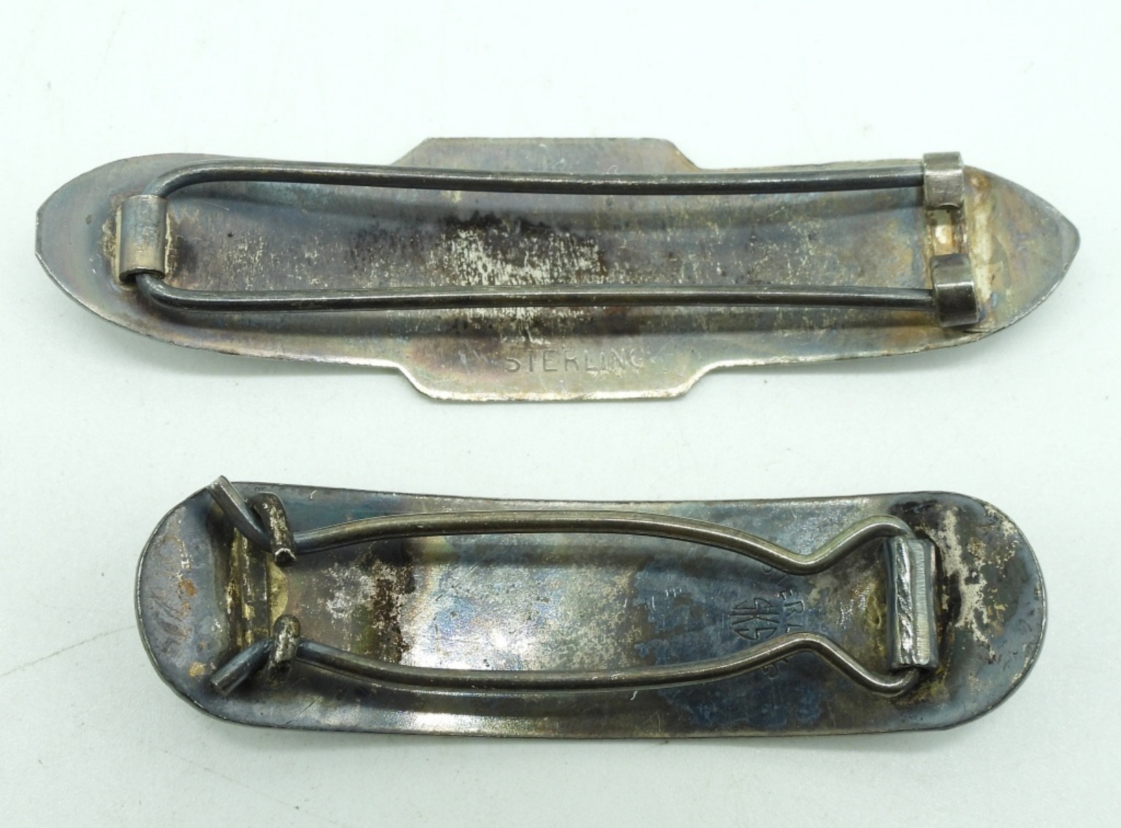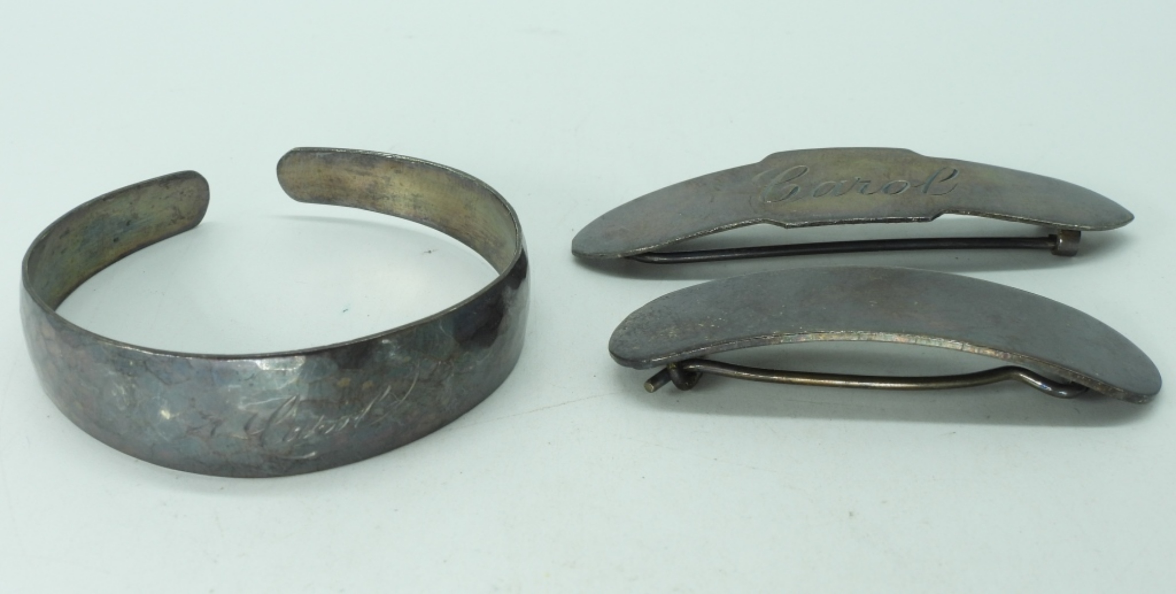 Two sterling antique hair clips (one engraved “Carol”), 2-2.5″ wide. Sterling cuff bracelet (engraved “Carol”) 6″. (14.8 dwt) (6x4x2)
