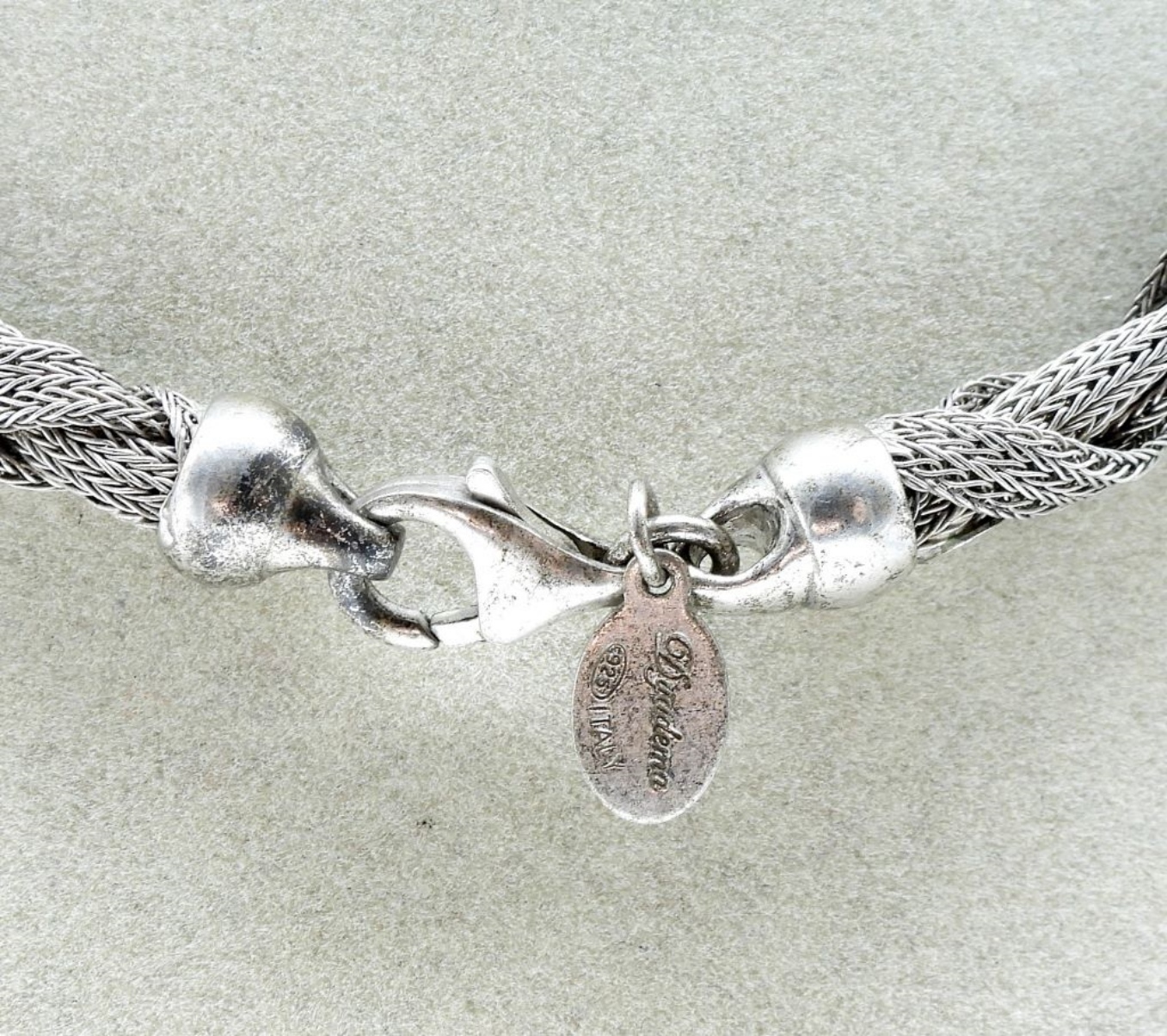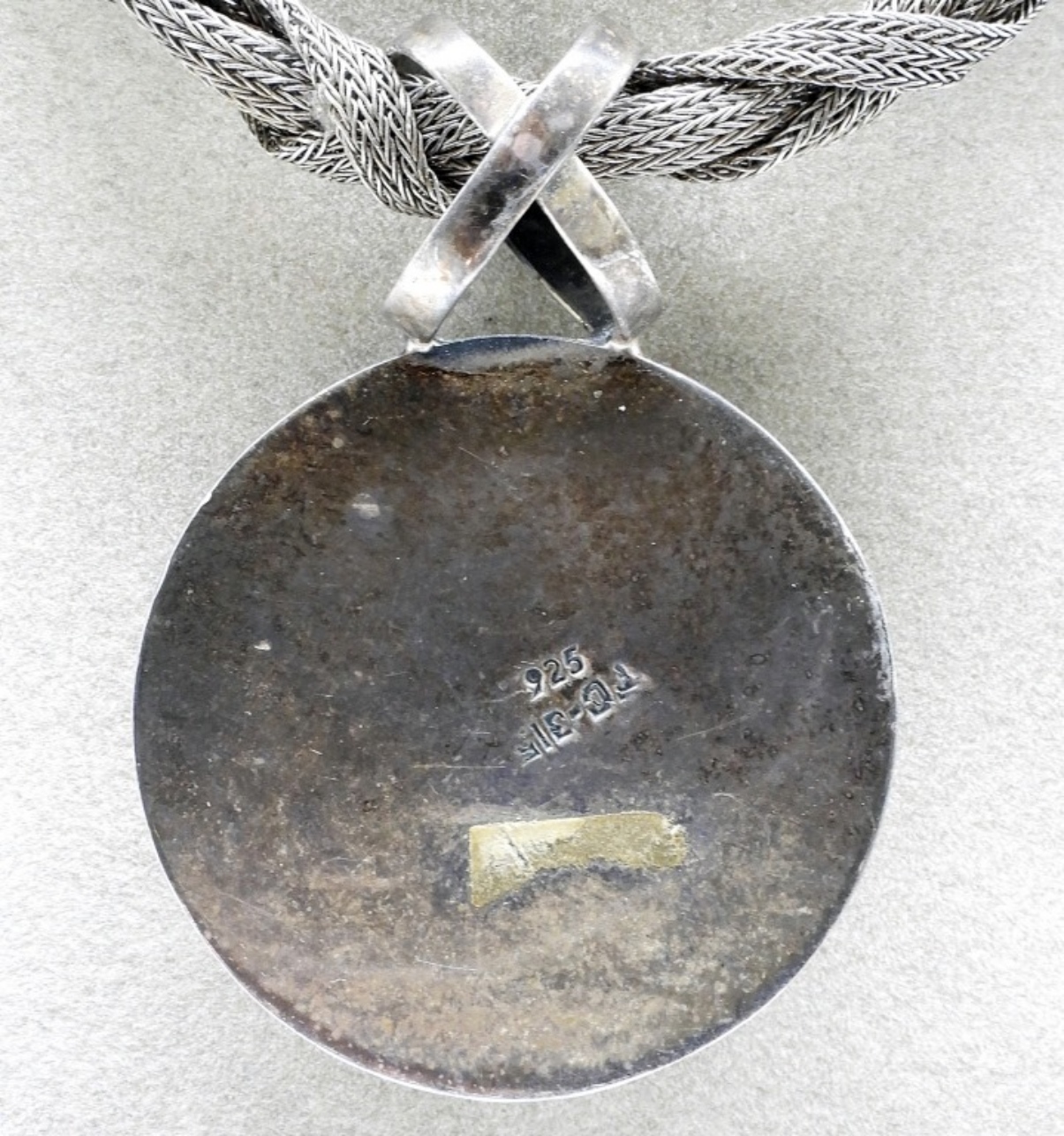 Taxco black onyx pendant, 2″ long. On a Dyadema brand, braided mesh sterling chain, 18″ long. (29 dwt)