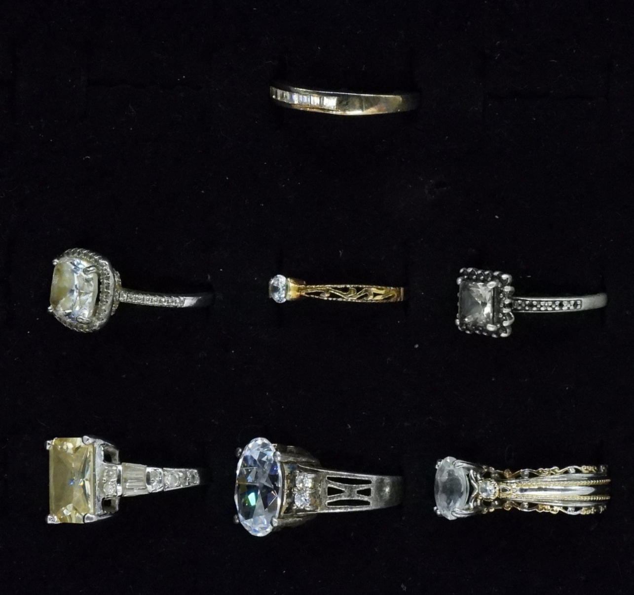 Seven gorgeous sterling rings with simulated diamonds. Very pretty rings! Sizes 6-9 (18 dwt) (6x4x2)