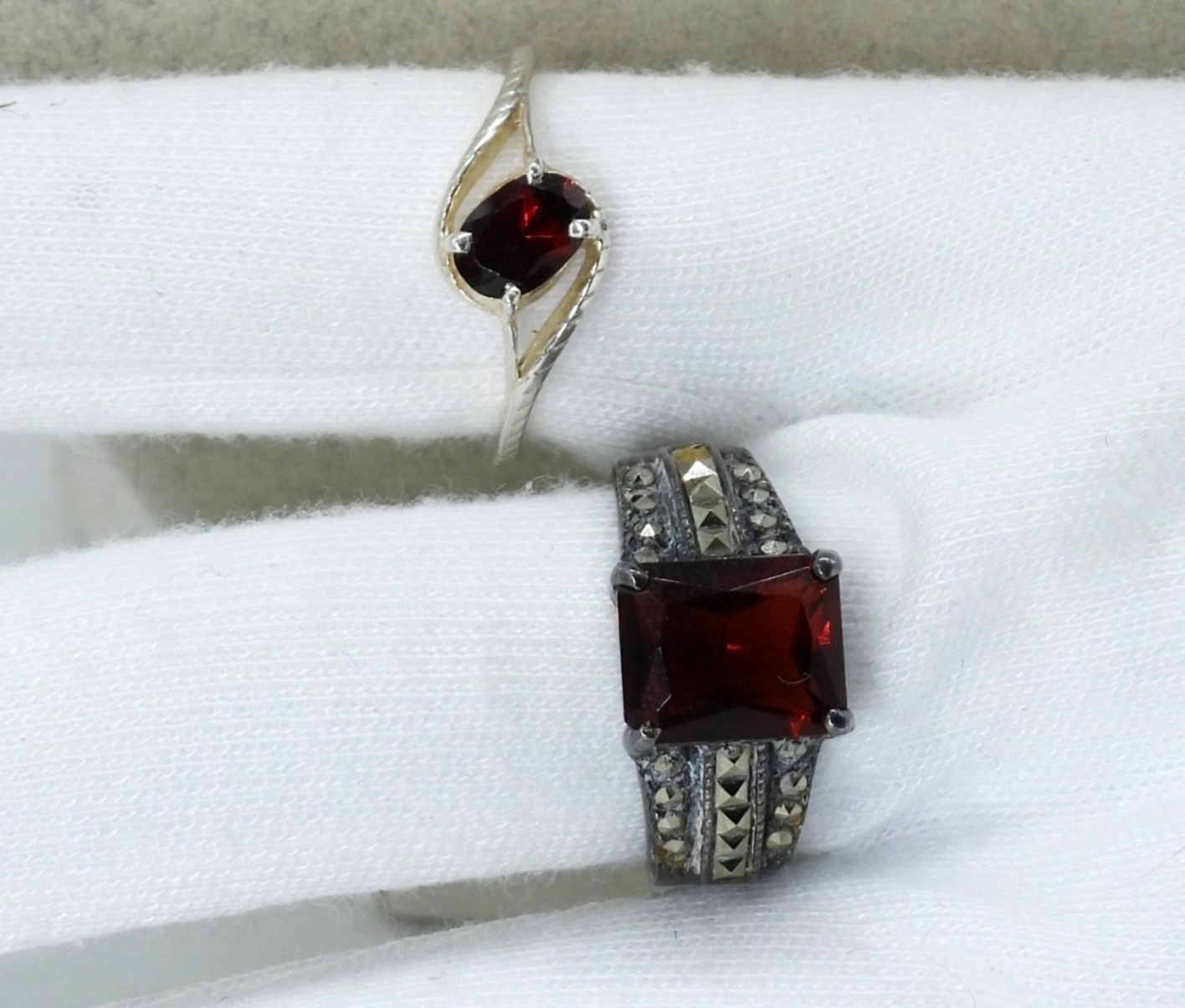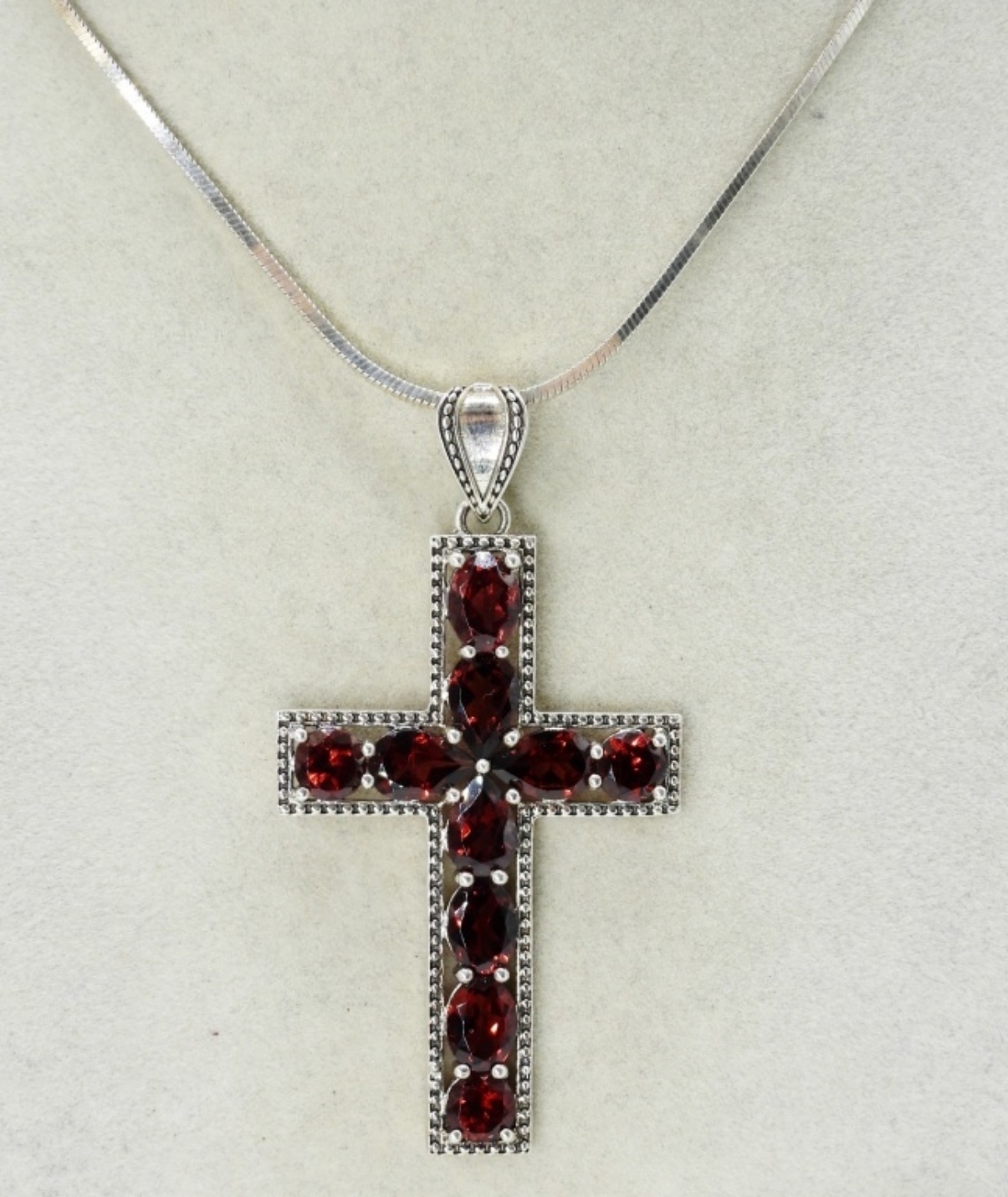 Garnet cross pendant and two rings, all sterling. Pendant is 2.5″ long and chain is 18″ long. Two sterling rings with garnet gemstones are sizes 7 & 7.5 (14.5 dwt)