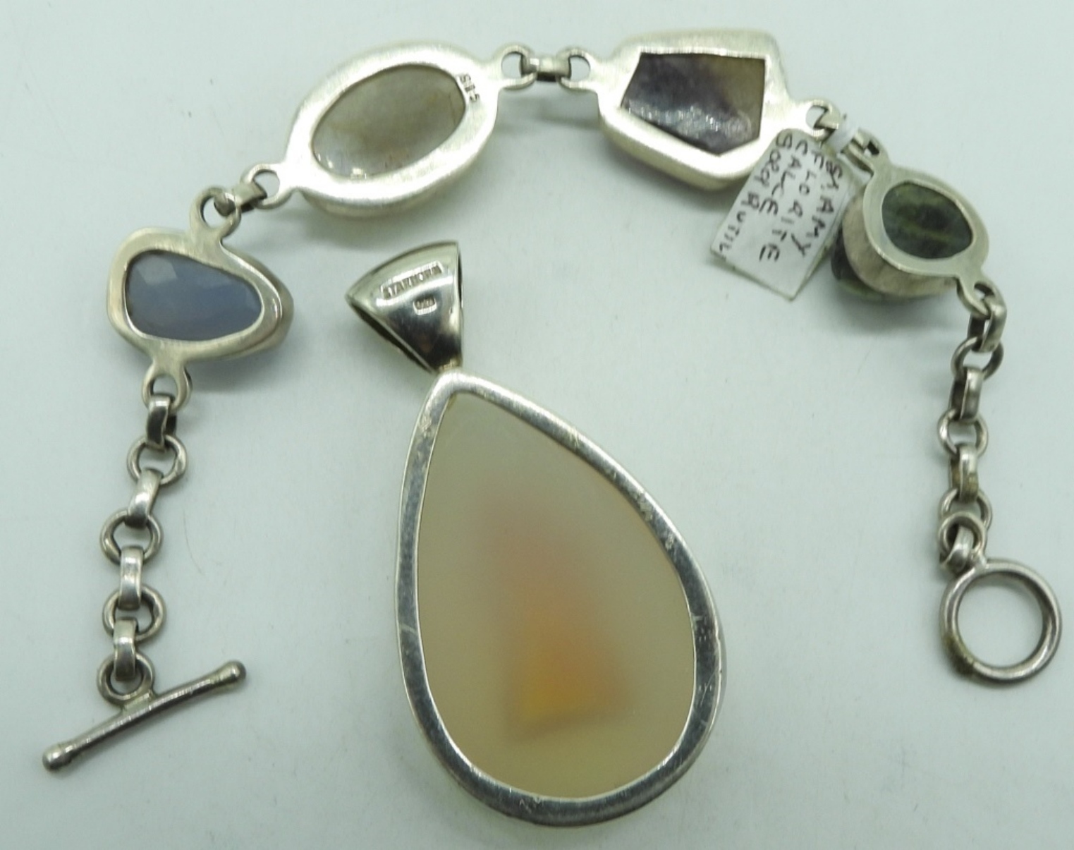 White druzy gemstone sterling pendant, 2.5″ long. Sterling carved gemstone bracelet, 7.5″ long. Green Amethyst, Fluorite & More. (22 dwt) (6x4x2)
