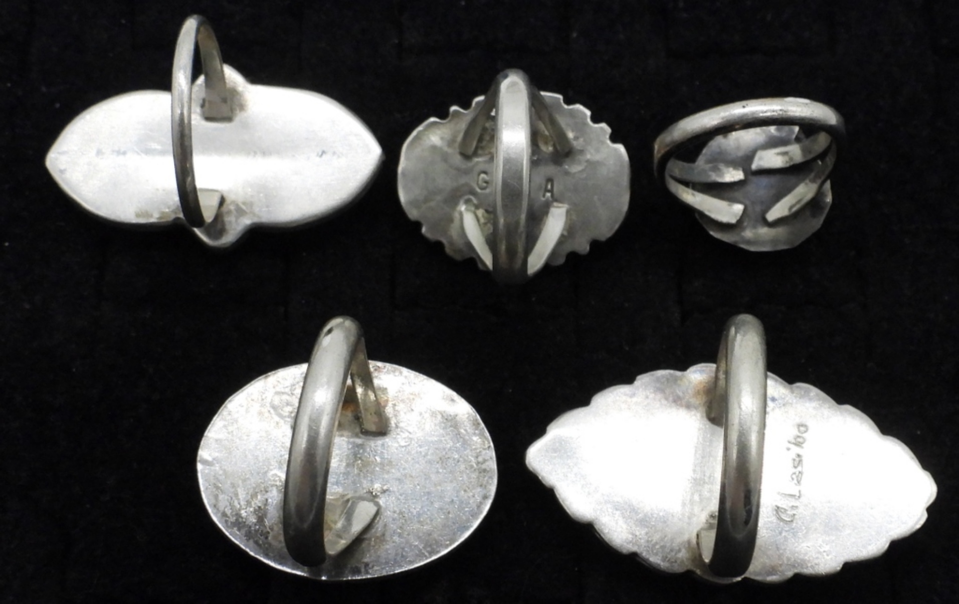 Five sterling mother of pearl gemstone rings, some turquoise. Very nice pieces of jewelry. Sizes 5-7. (18.5 dwt)