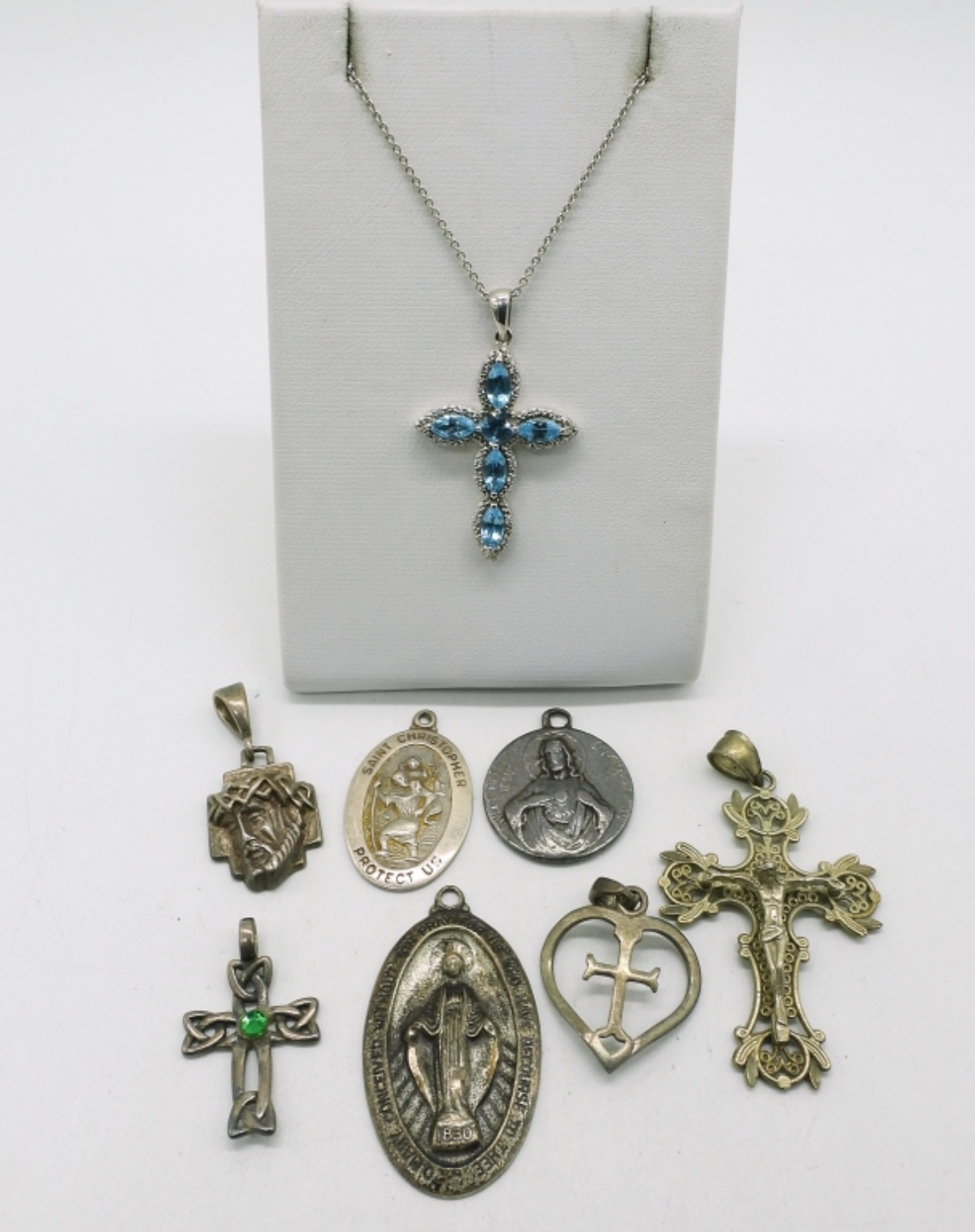 Eight sterling religious pendants. One sterling chain, 18″ long. (20 dwt) (6x4x2)