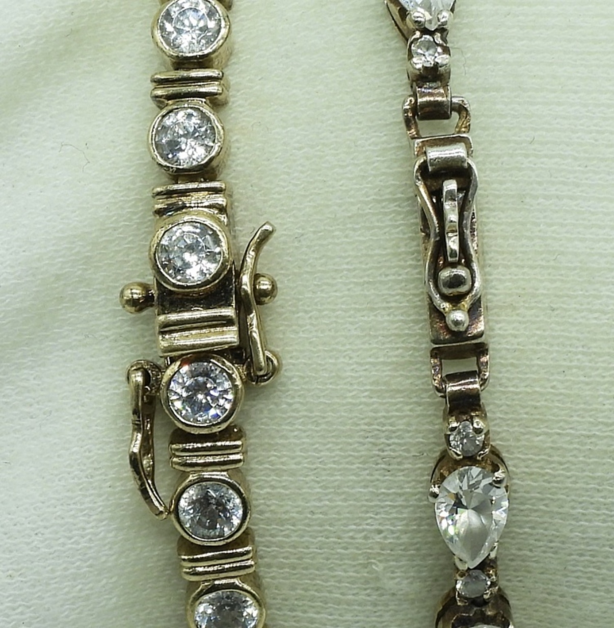 Two sterling, gold tone simulated diamond, tennis bracelets. 7-8″ long. (18.6 dwt)