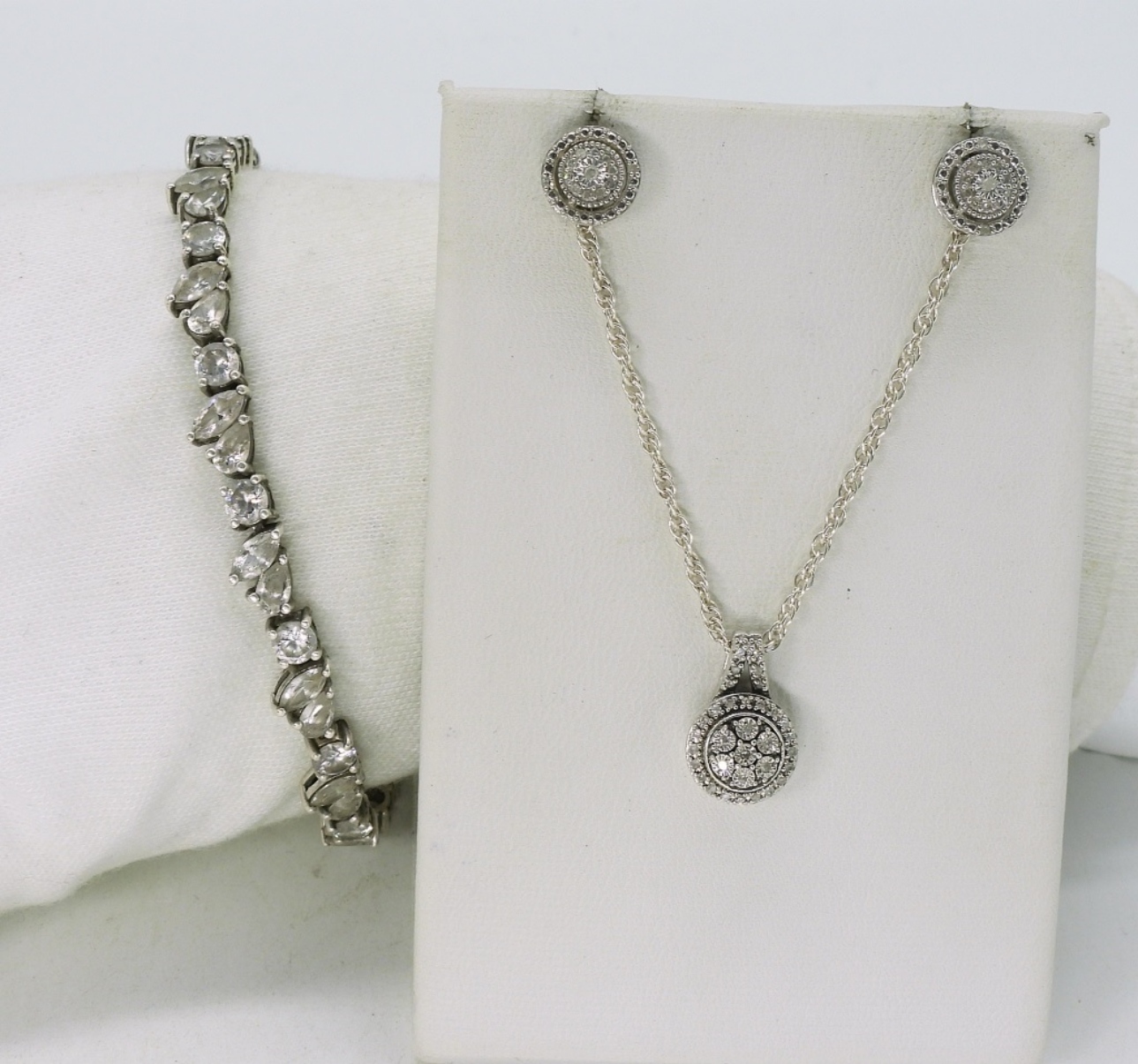 Gorgeous sterling simulated diamond necklace & earring set. Necklace is 20″. Simulated diamond bracelet, 8″. (12.4 dwt) (6x4x2)