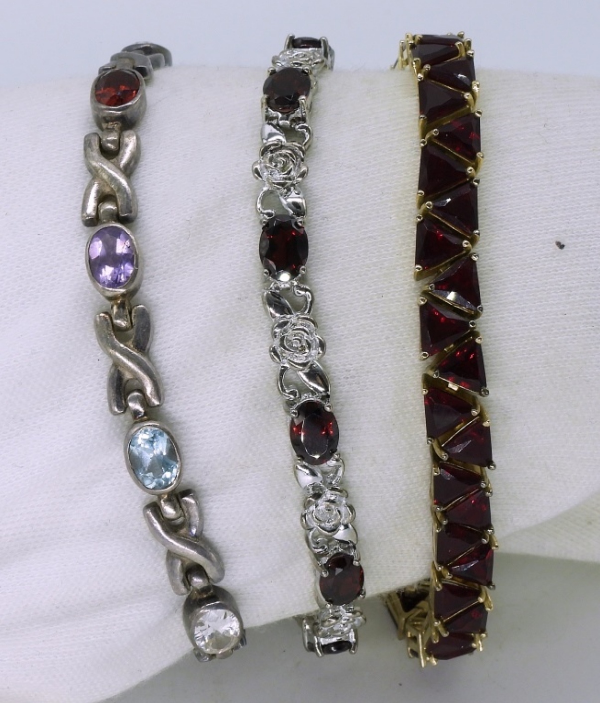 Three sterling bracelets, with garnet gemstones. 7.5-8″ long. (27 dwt)