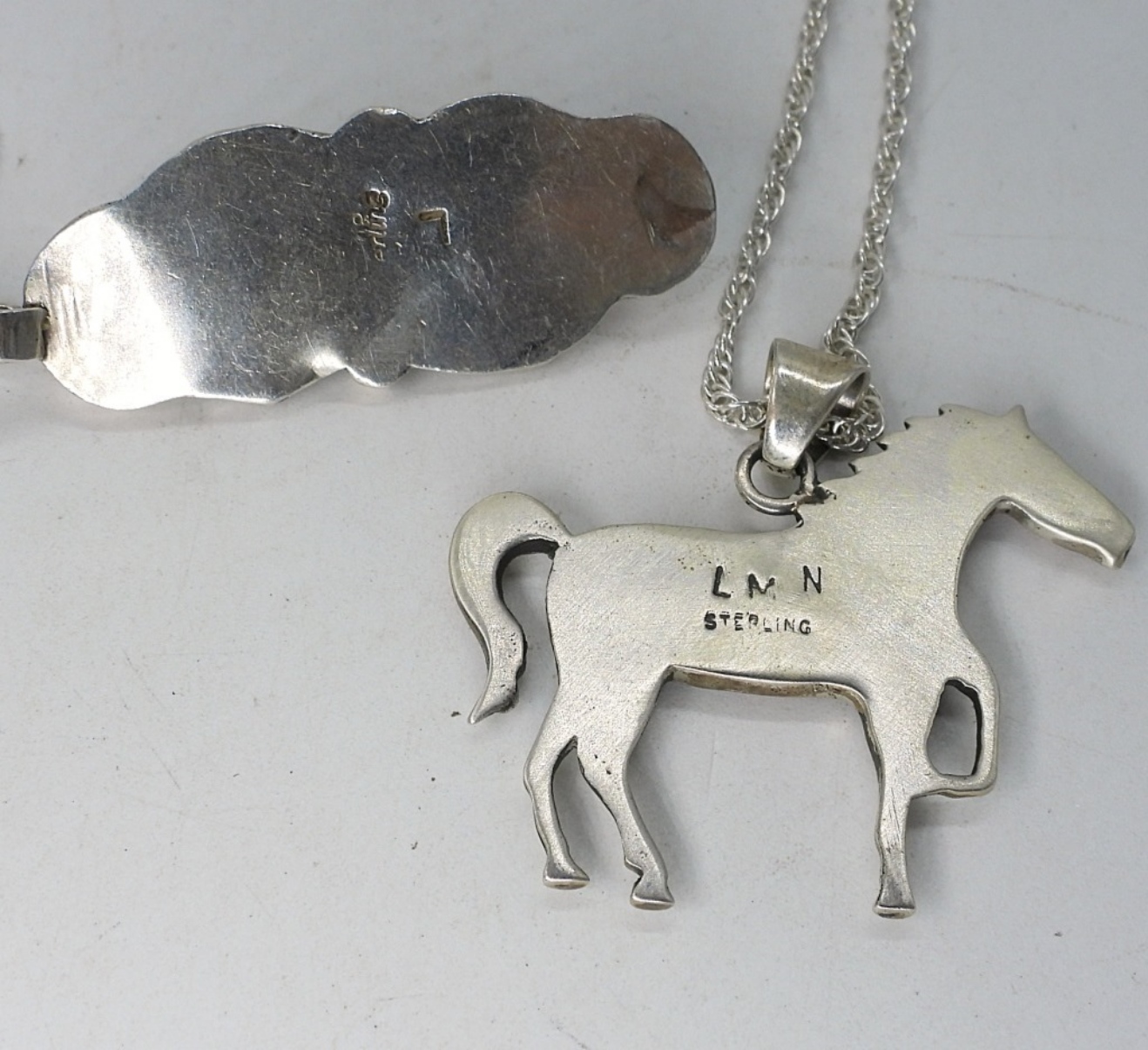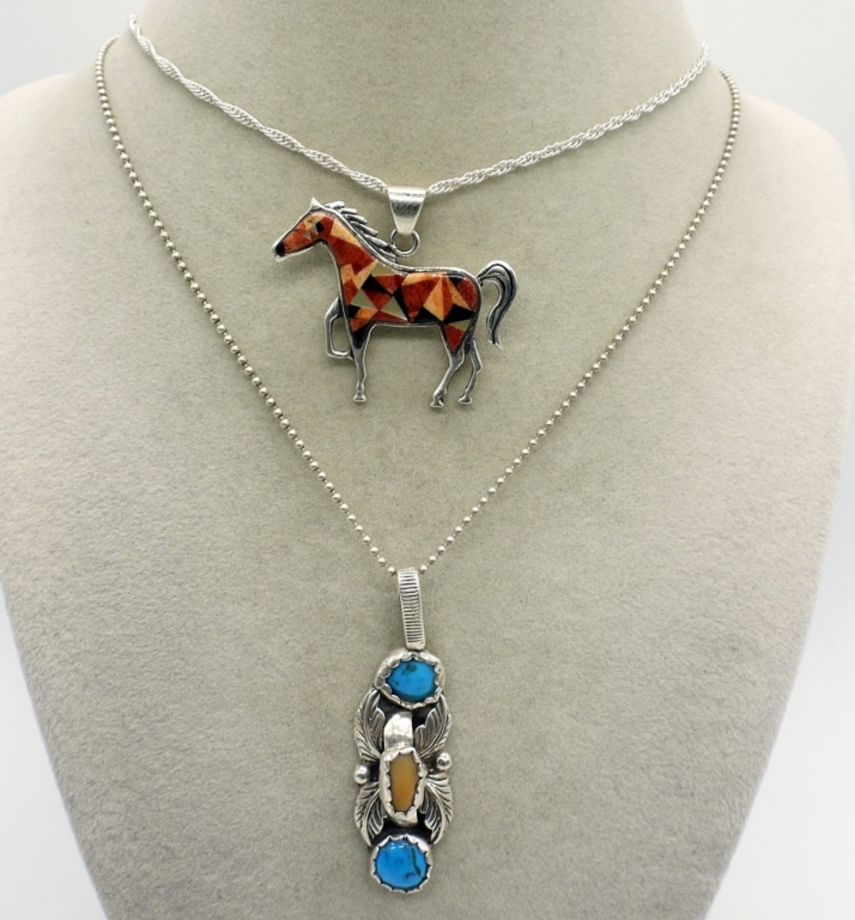 Two sterling necklaces with Native American stamps on the backs of the pendants. Sterling chains 16″ & 18″ long. (10 dwt)