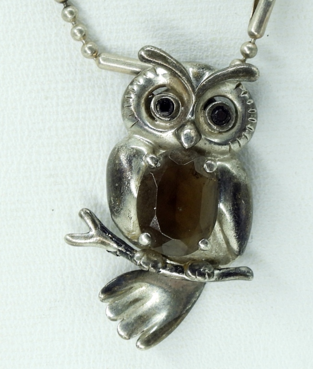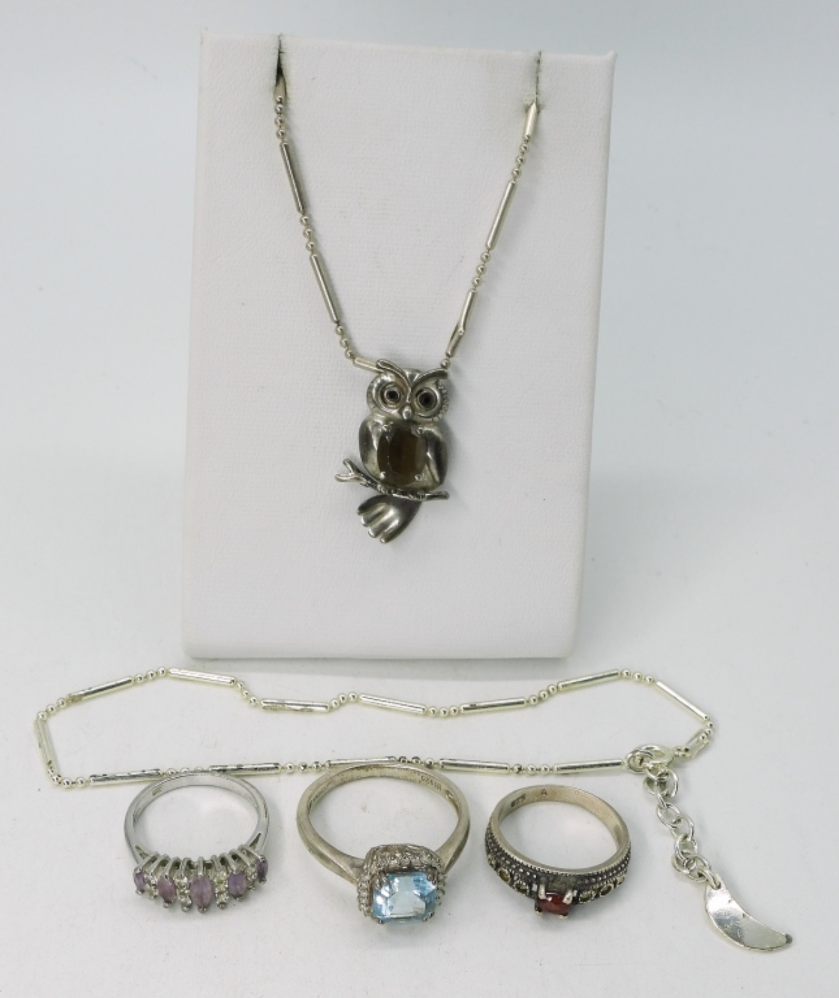 Adorable smokey quartz owl necklace, 18″. Matching moon bracelet / anklet, 8-11″. 3 sterling rings, sizes 6 & 10. (13.3 dwt) (6x4x2)