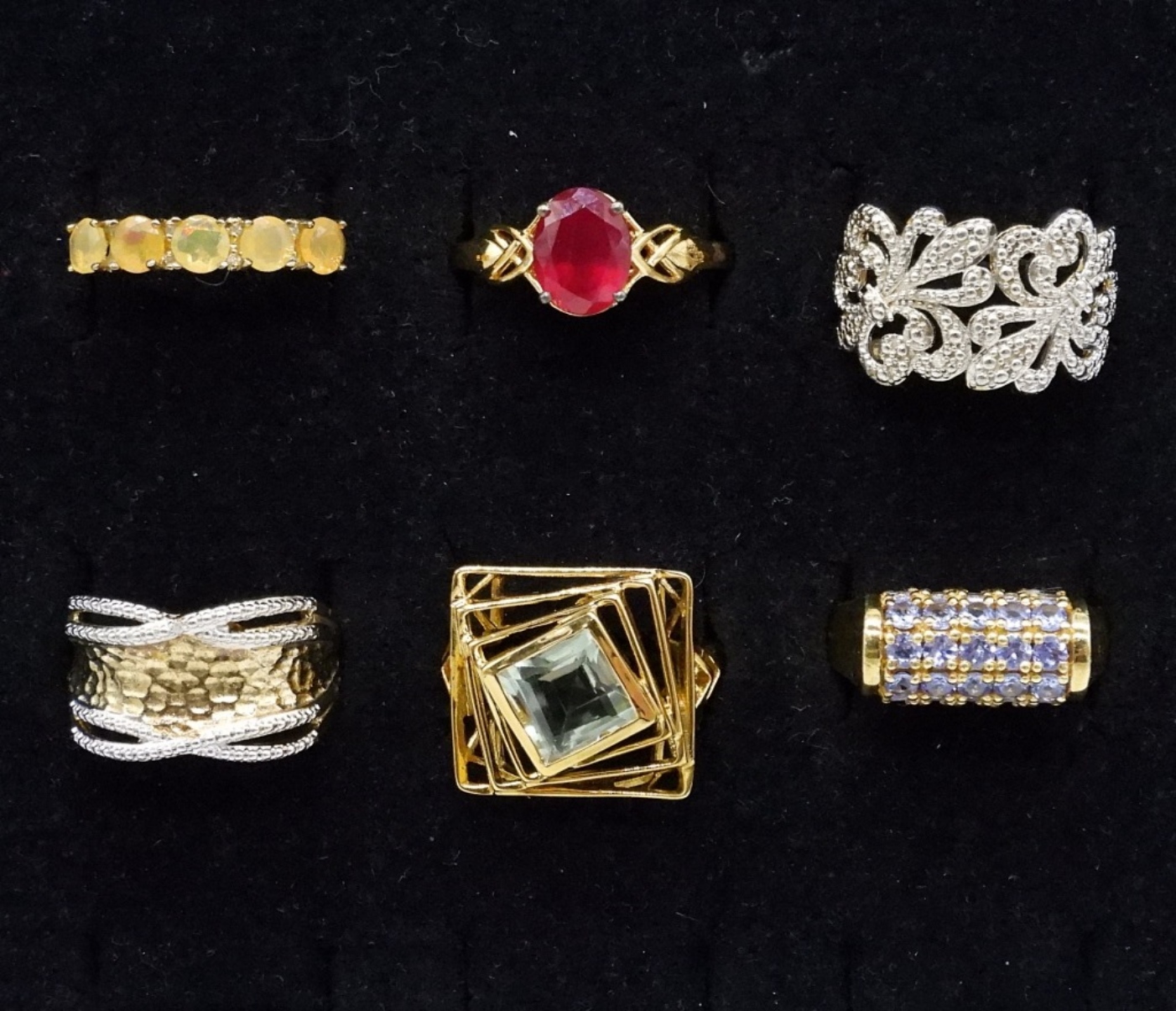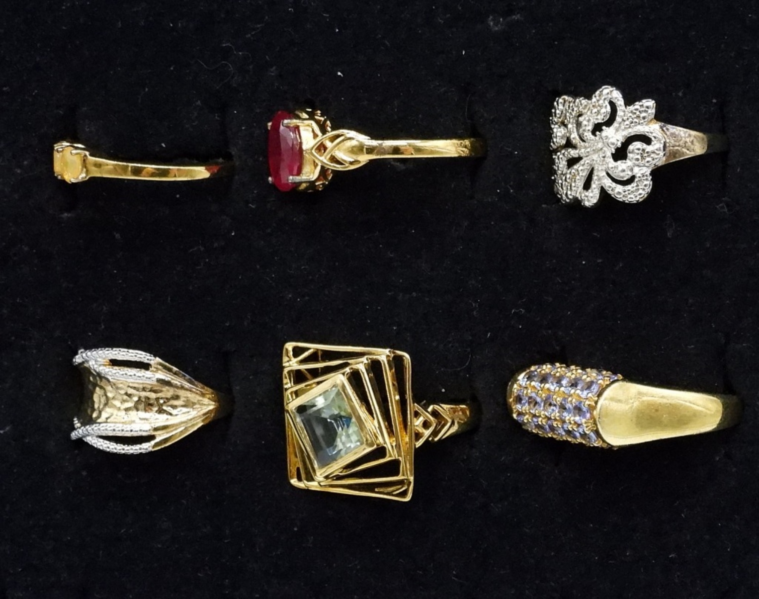 Six gold tone sterling fashion gemstone rings. Sizes 6, 7, 8. (15 dwt)