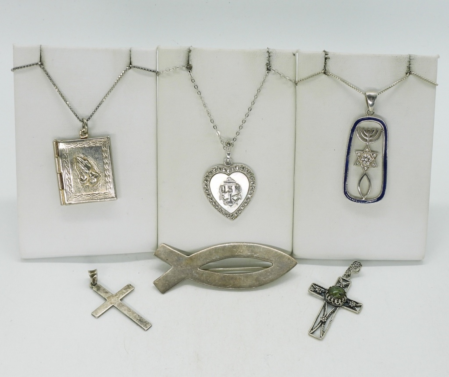 Sterling religious pendants and pin. Necklaces are 18″ – 30″. Fish pin, 2.5″ wide. (27.5 dwt) (6x4x2)