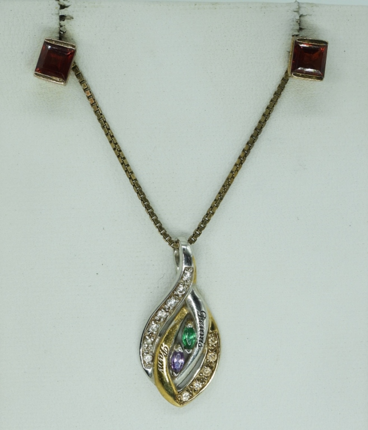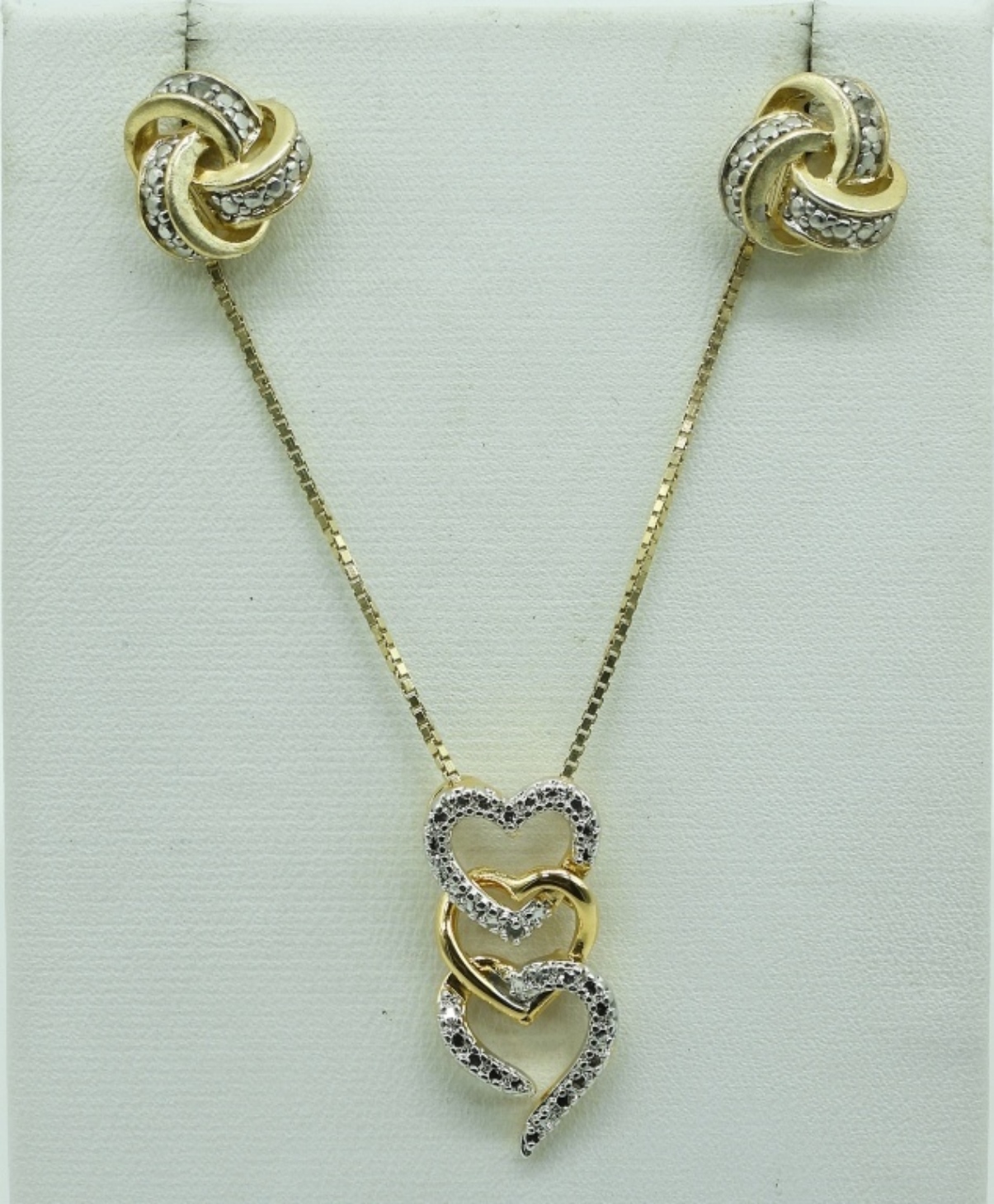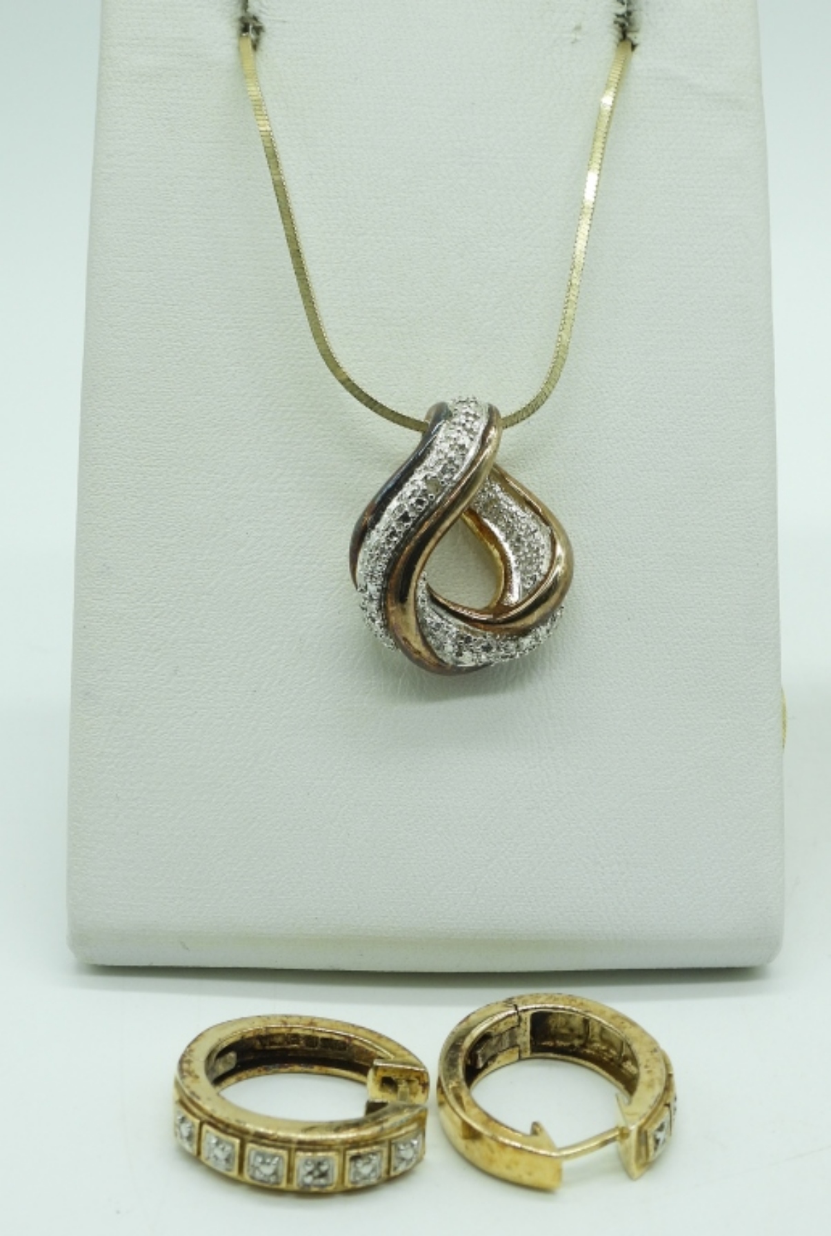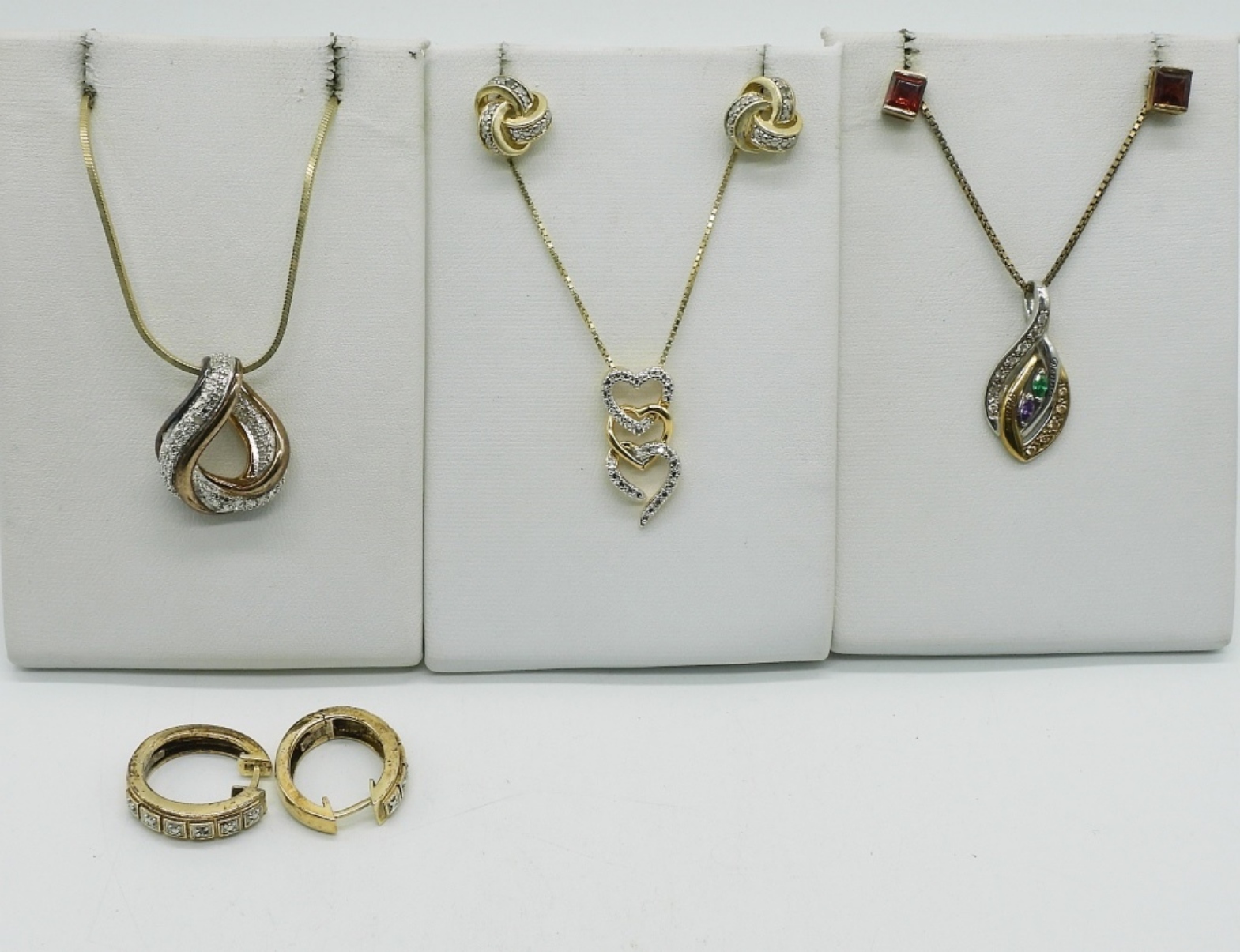 Six sterling gold tone pierced earrings and necklaces. Necklaces are 16-20″ long. Three pair of gold tone 925 pierced earrings. (17 dwt)