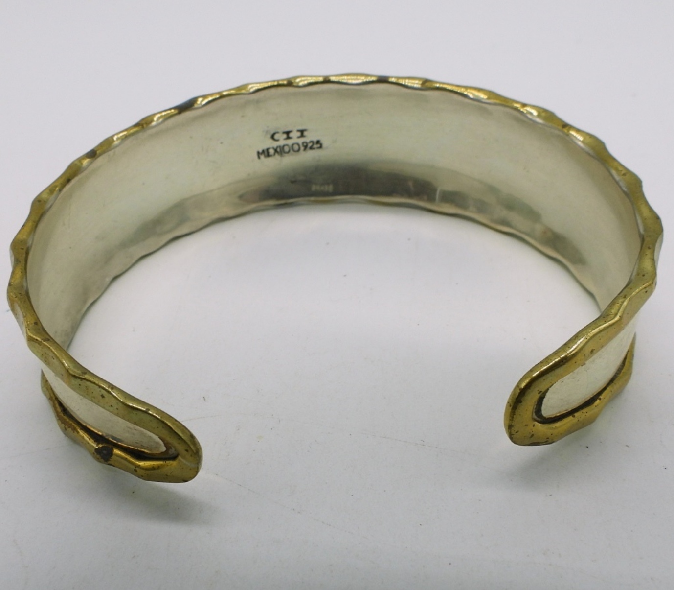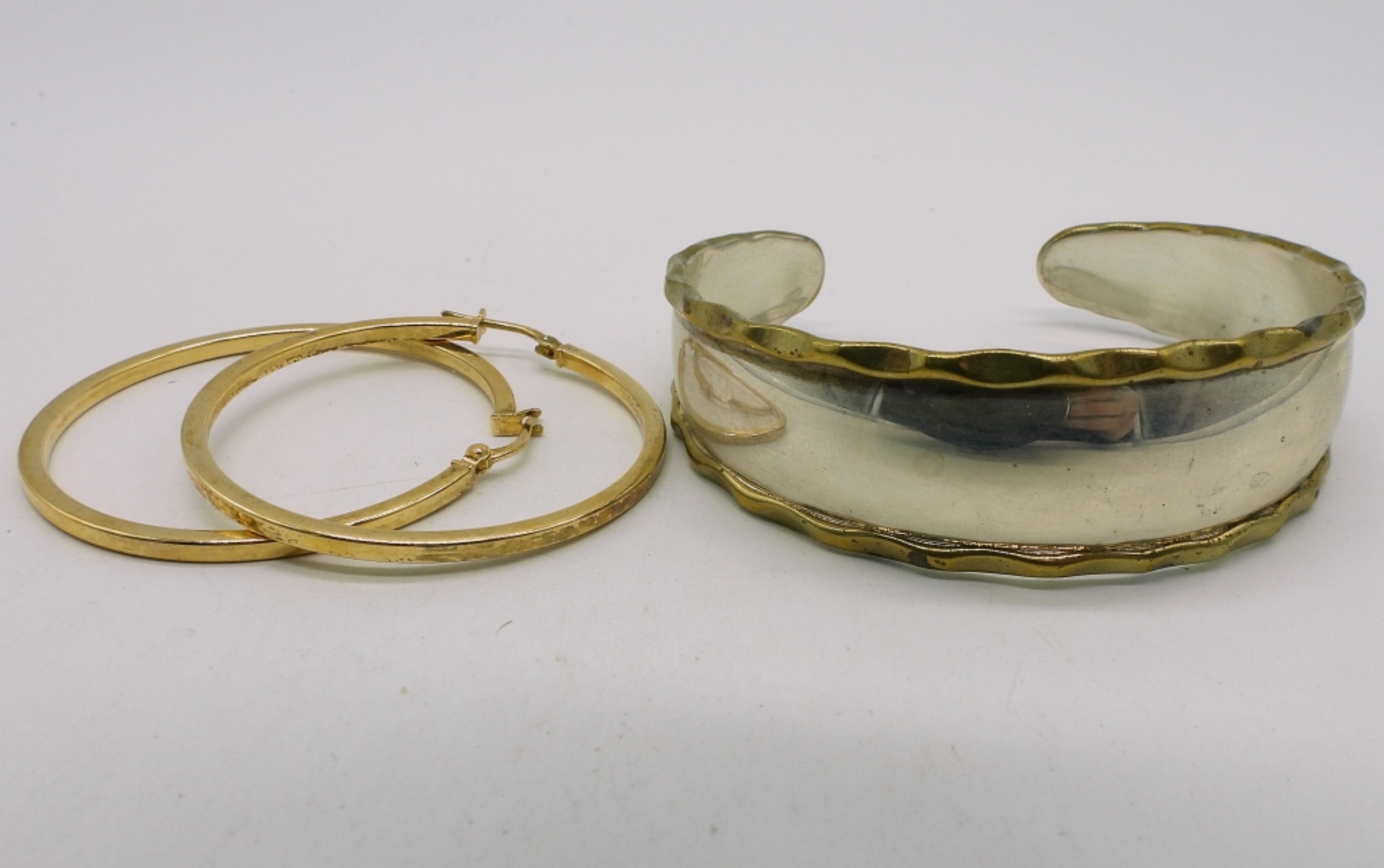 Sterling gold toned cuff bracelet. Gold tone sterling hoop pierced earrings, 1.5″ long. (12.6 dwt)