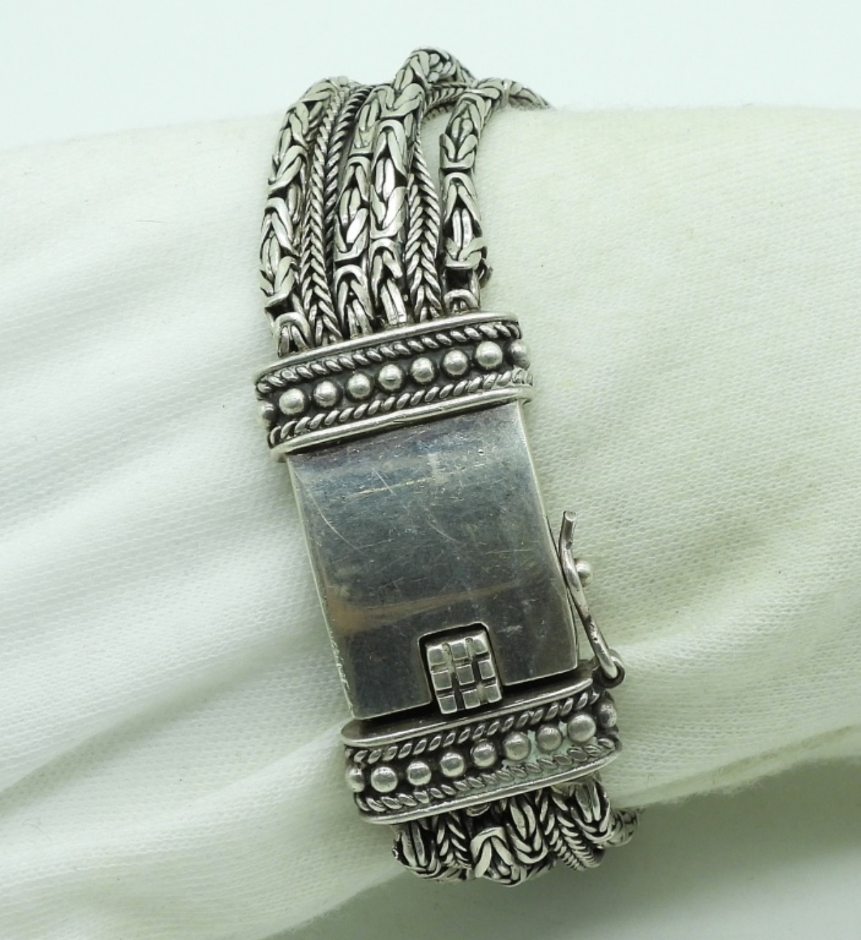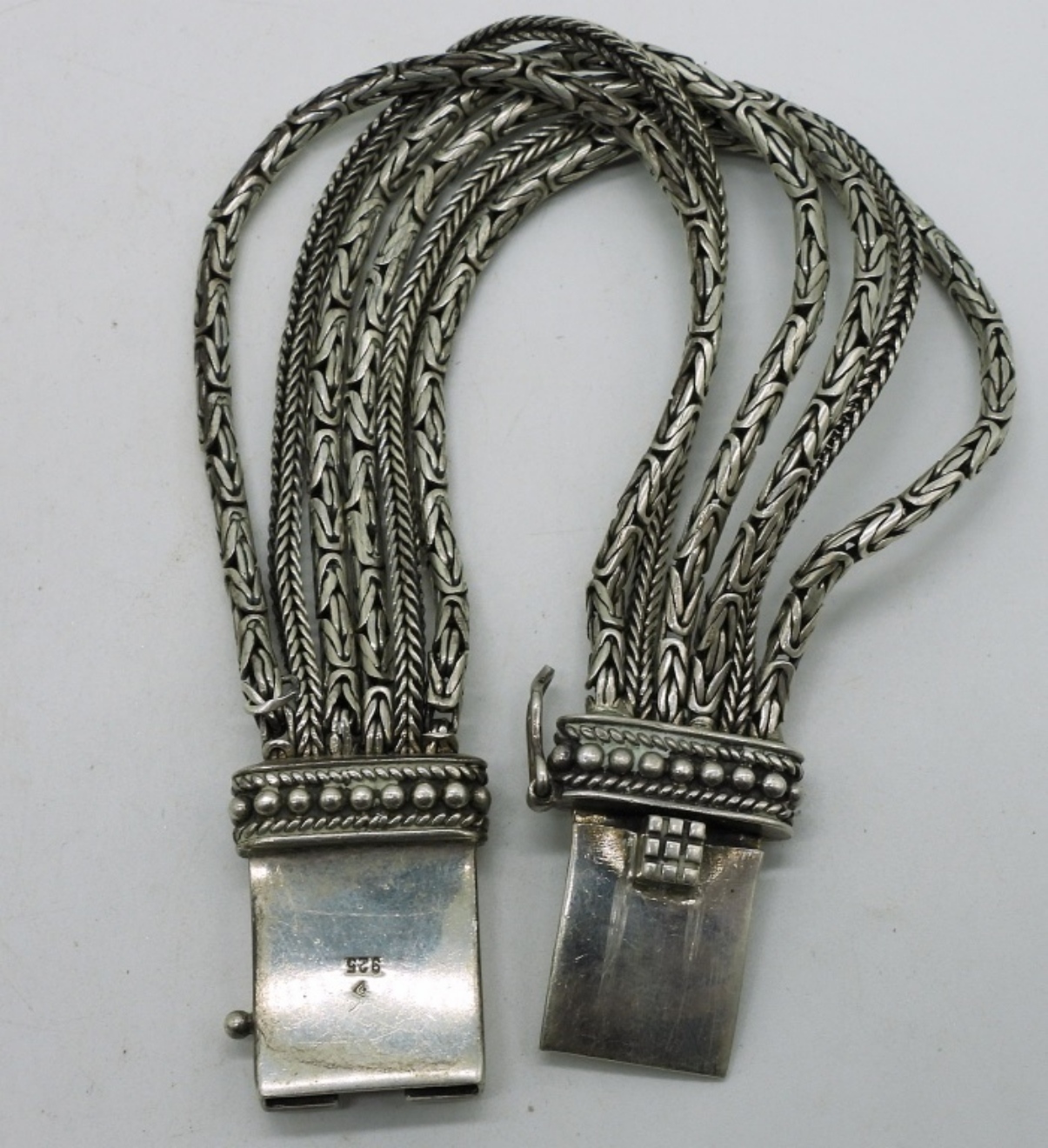 Six strand sterling fashion bracelet, 7.5″ long, very heavy! Clasp works great! (38.5 dwt) (6x4x2)
