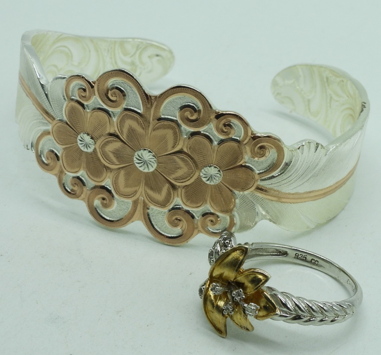 Sterling floral cuff bracelet and sterling flower ring, size 7. (27 dwt) (6x4x2)