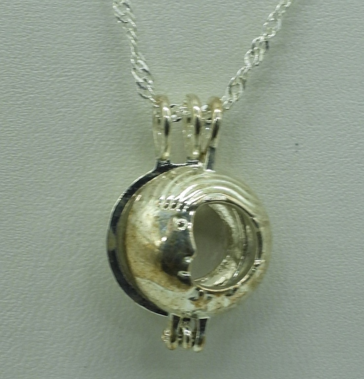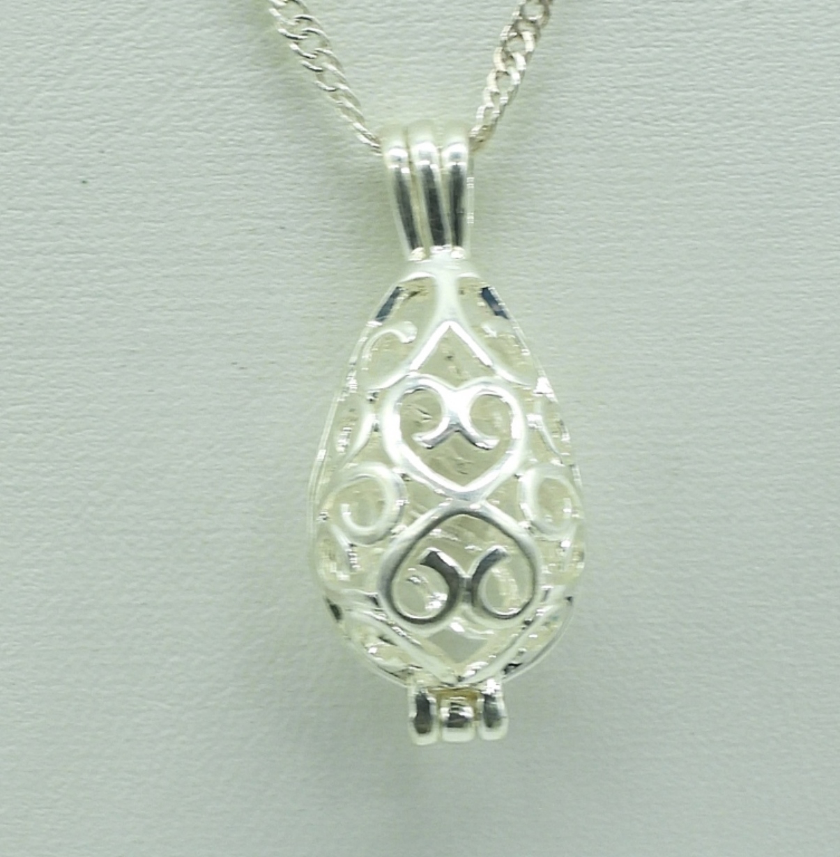 Four sterling pendants that open for scented beads. Four sterling chains, 20″ long. (13.9 dwt)