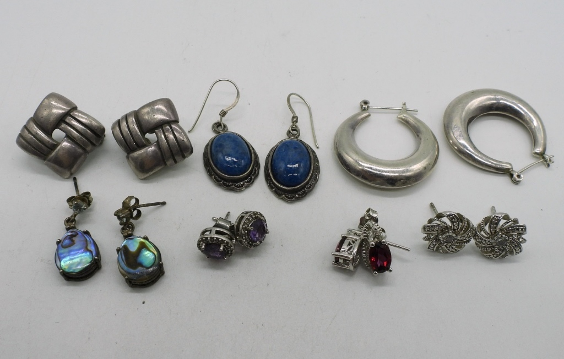 Seven pair of sterling pierced earrings. Abalone, Amethyst, Garnet & More. (22 dwt) (6x4x2)