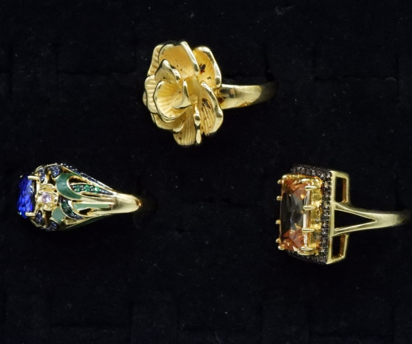 Three sterling gold tone fashion rings, with large gemstones. Simulated Topaz & simulated Amethyst. Ring size 10 for all. (18 dwt)