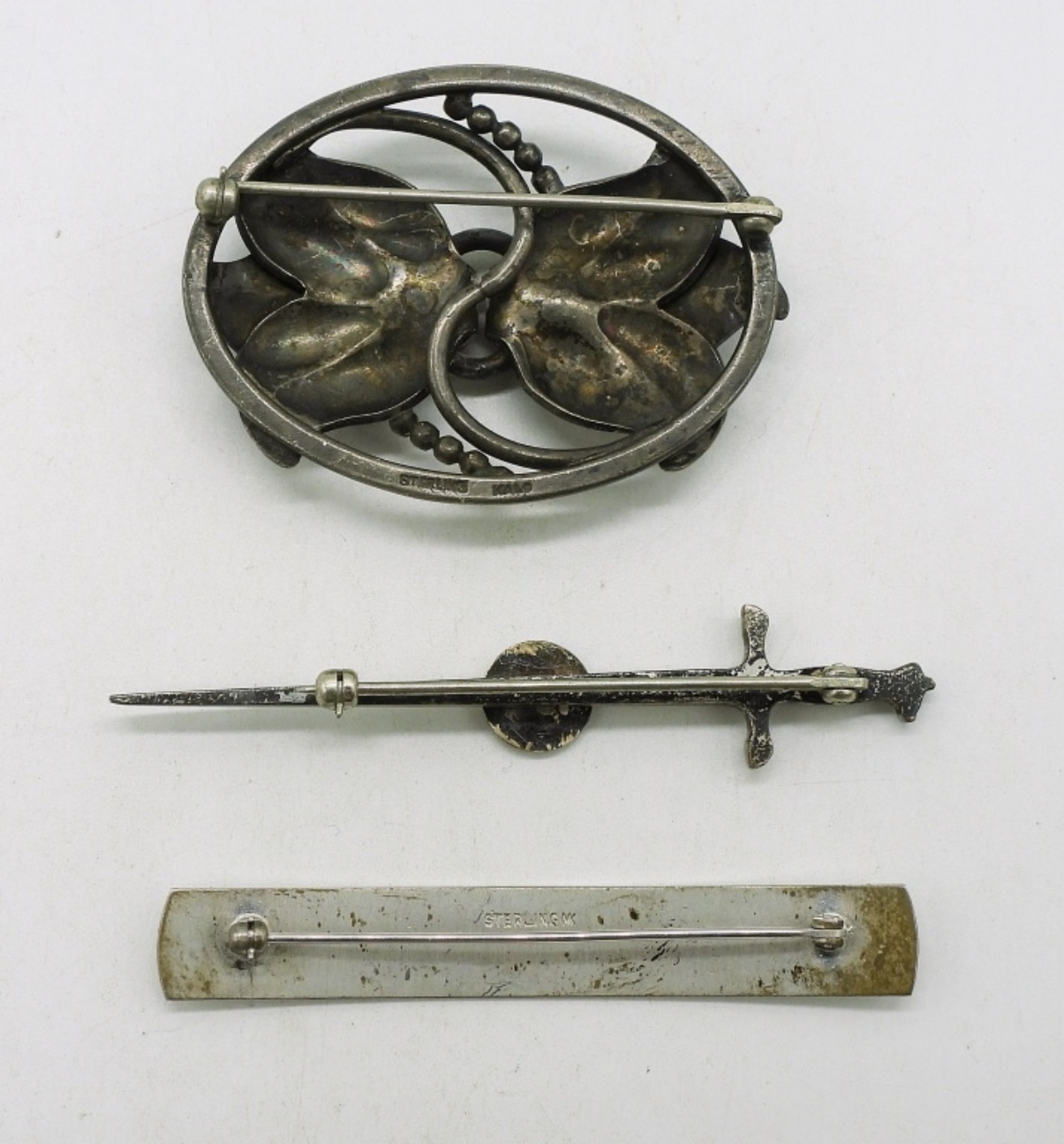 Three vintage sterling brooches. 2″ – 3″. (23.2 dwt) (6x4x2)