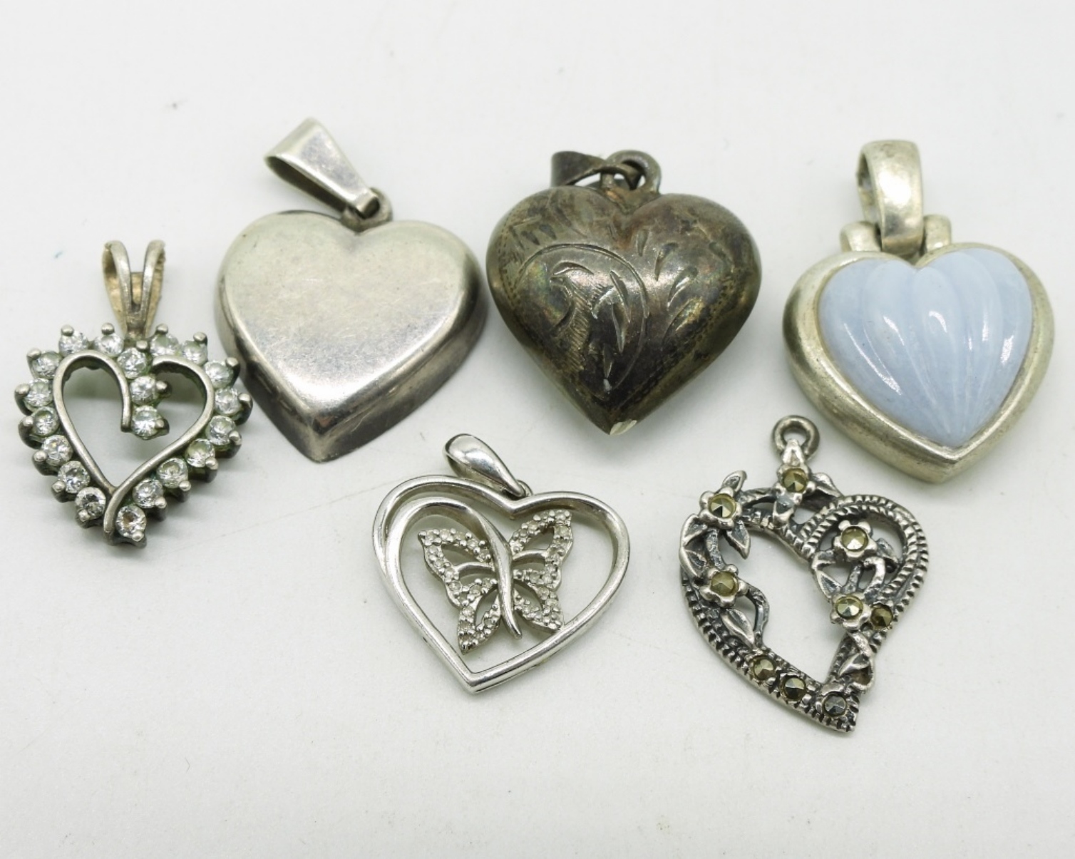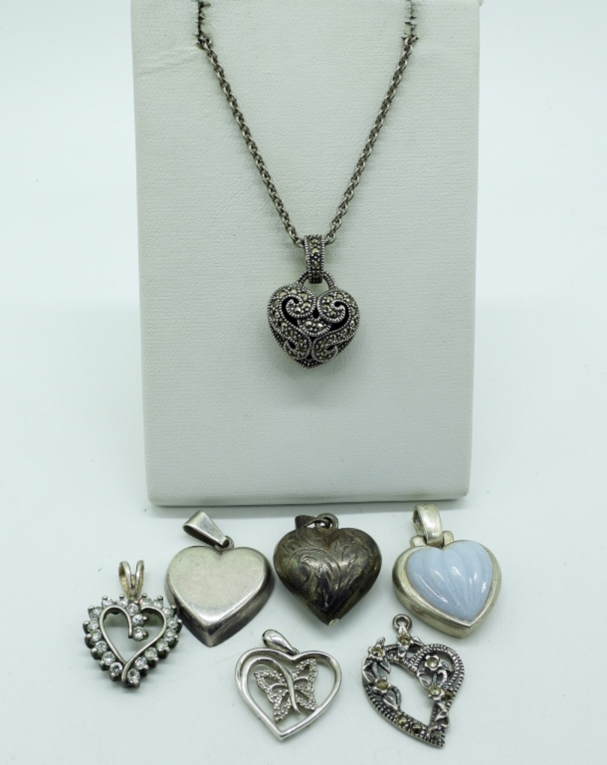 Seven sterling heart shaped pendants, all around 1″ long. One sterling chain, 16″ long. (16 dwt)