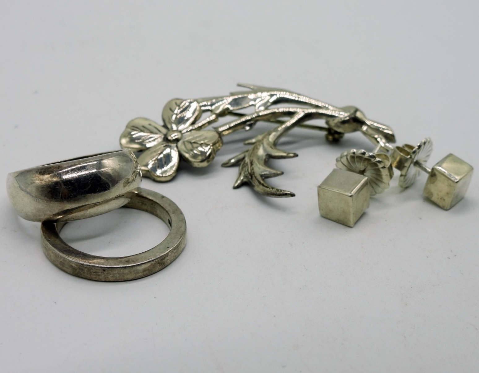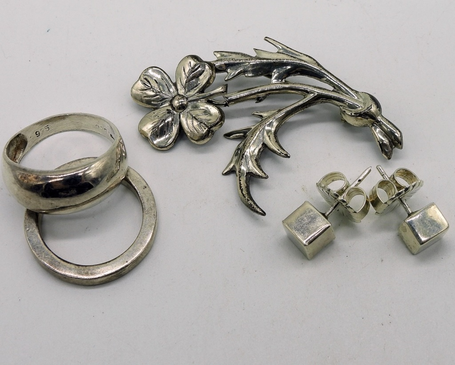 Two plain sterling rings, size 7. Square sterling pierced earrings. Floral brooch, 2″ wide. (8.5 dwt)