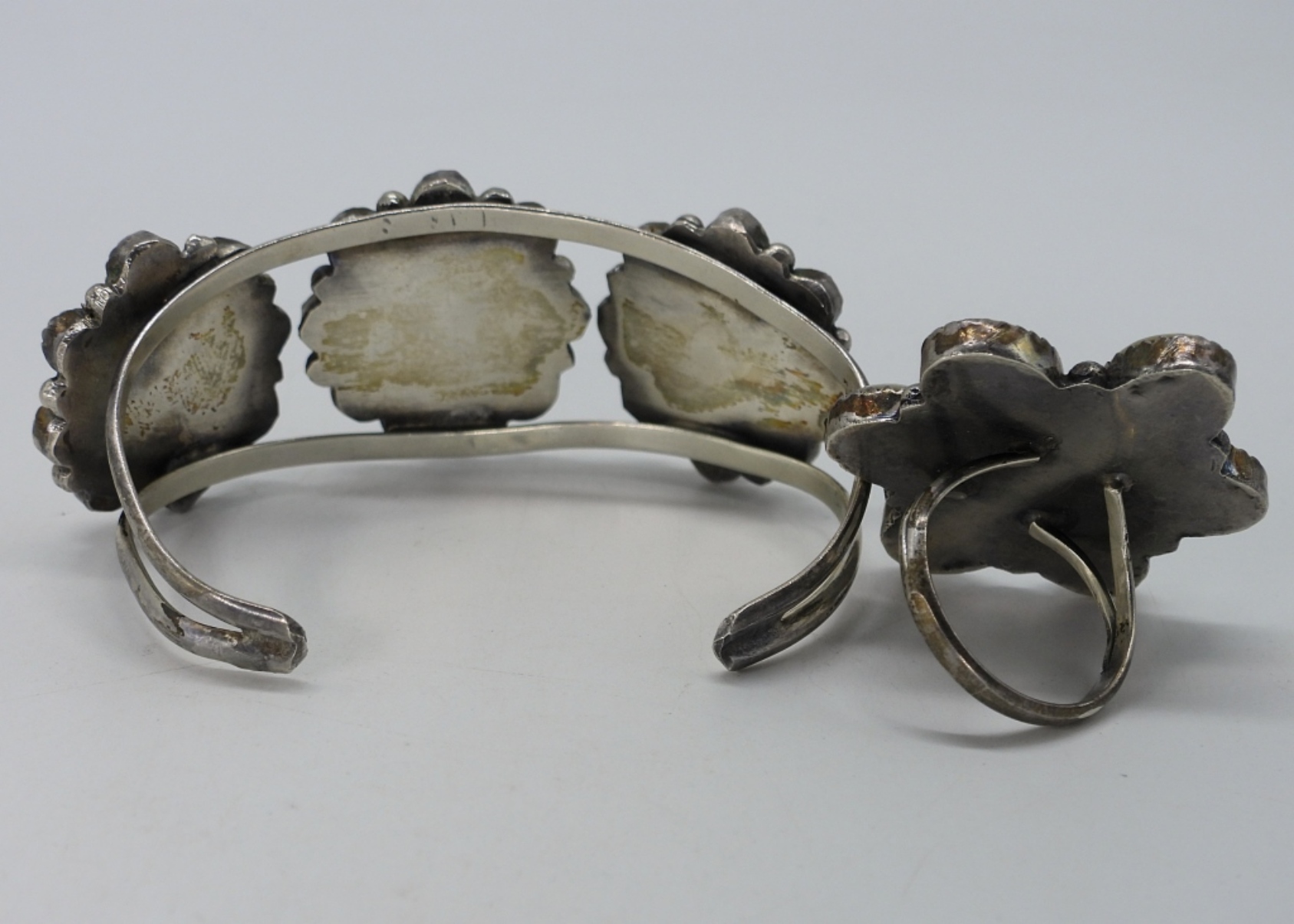 Mother of Pearl gemstone sterling cuff bracelet and matching ring, size 7. There are no markings on this. (19 dwt)