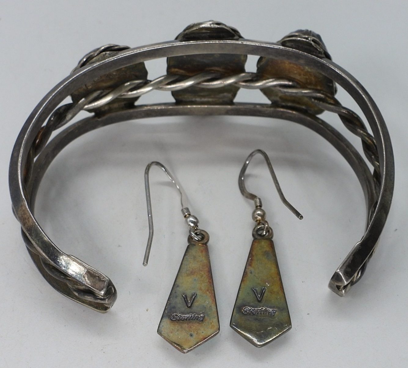 Sterling turquoise gemstone cuff bracelet, marked “Sterling”. Pierced dangling earrings with turquoise and opal gemstones, 1.5″ long. Earrings are marked “Sterling V”. (20.9 dwt)