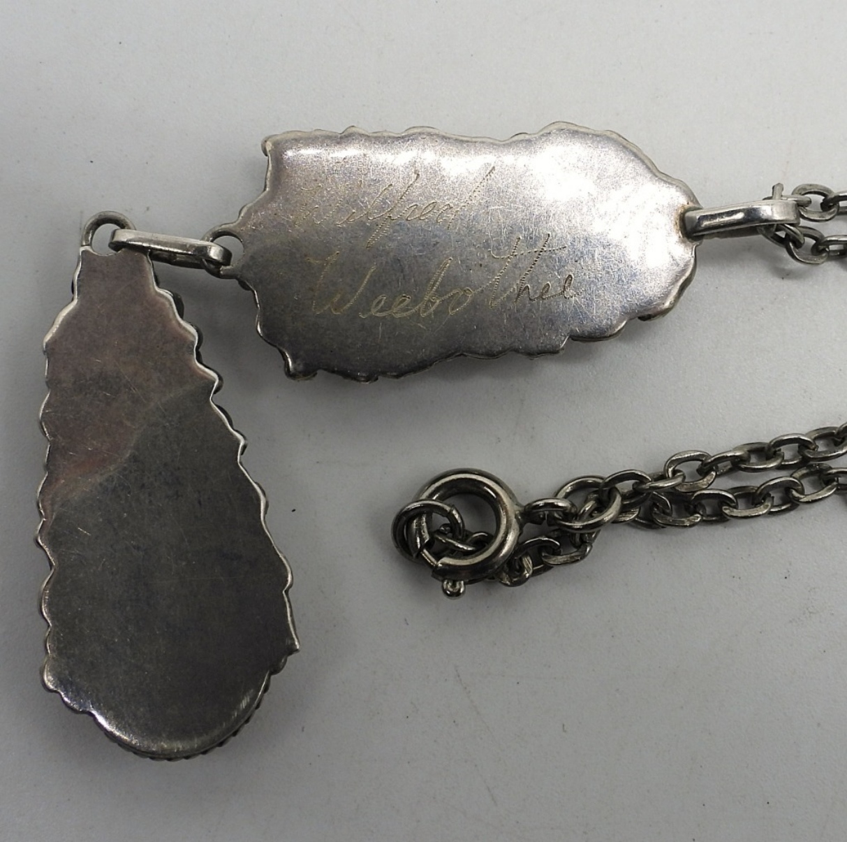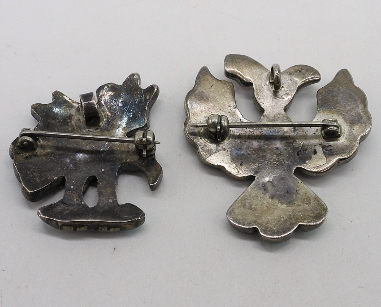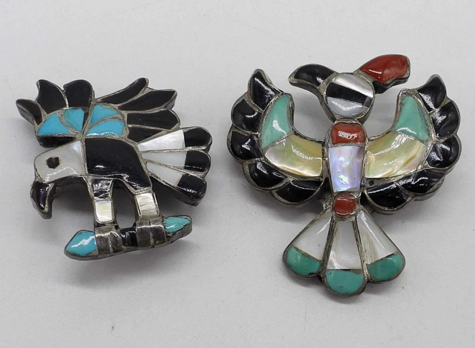 Two zuni sterling eagle brooch / pendants. 1.5″ long. Zuni sterling necklace, 16″ long. Brooches are not signed or marked, Necklace is signed (see photos). (13.6 dwt)