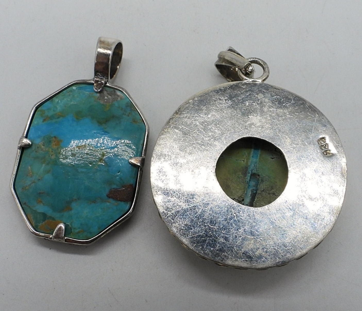 Two sterling pendants with large turquoise gemstones. Both 2″ long. (12 dwt)