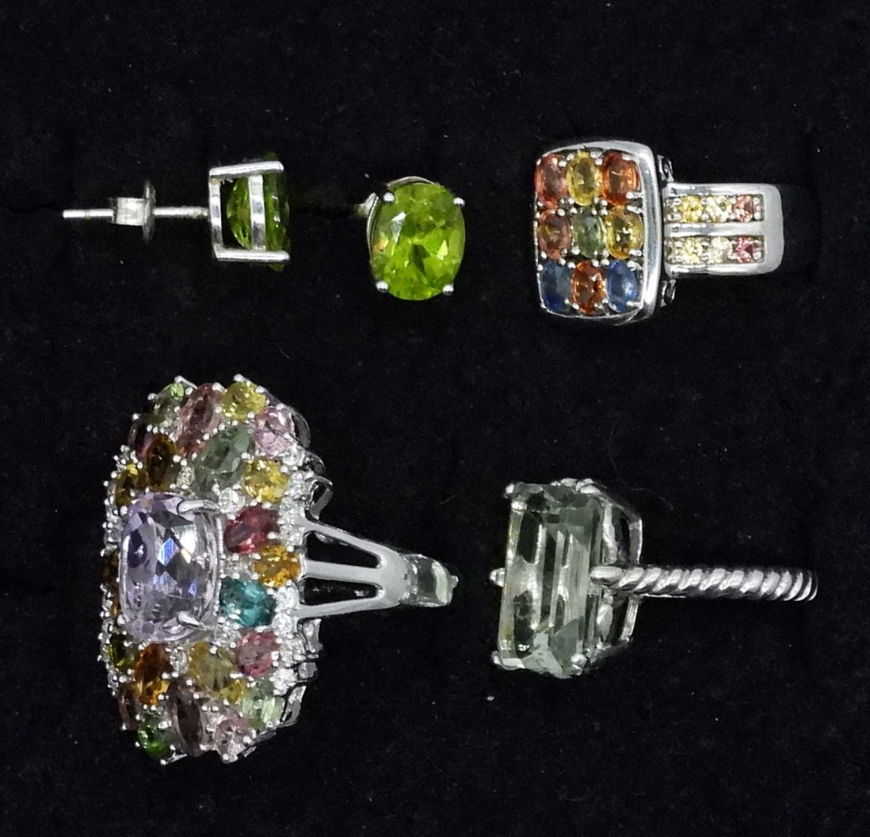Three sterling multi gemstone rings, size 7 & 8. One pair of pierced green gemstone earrings. (12 dwt)