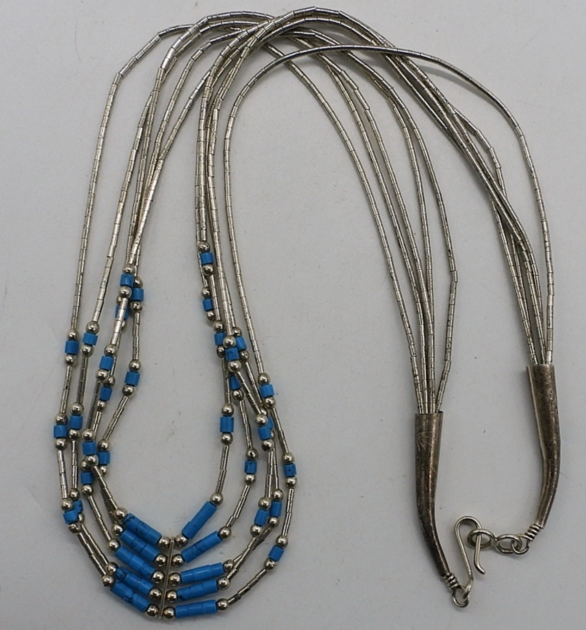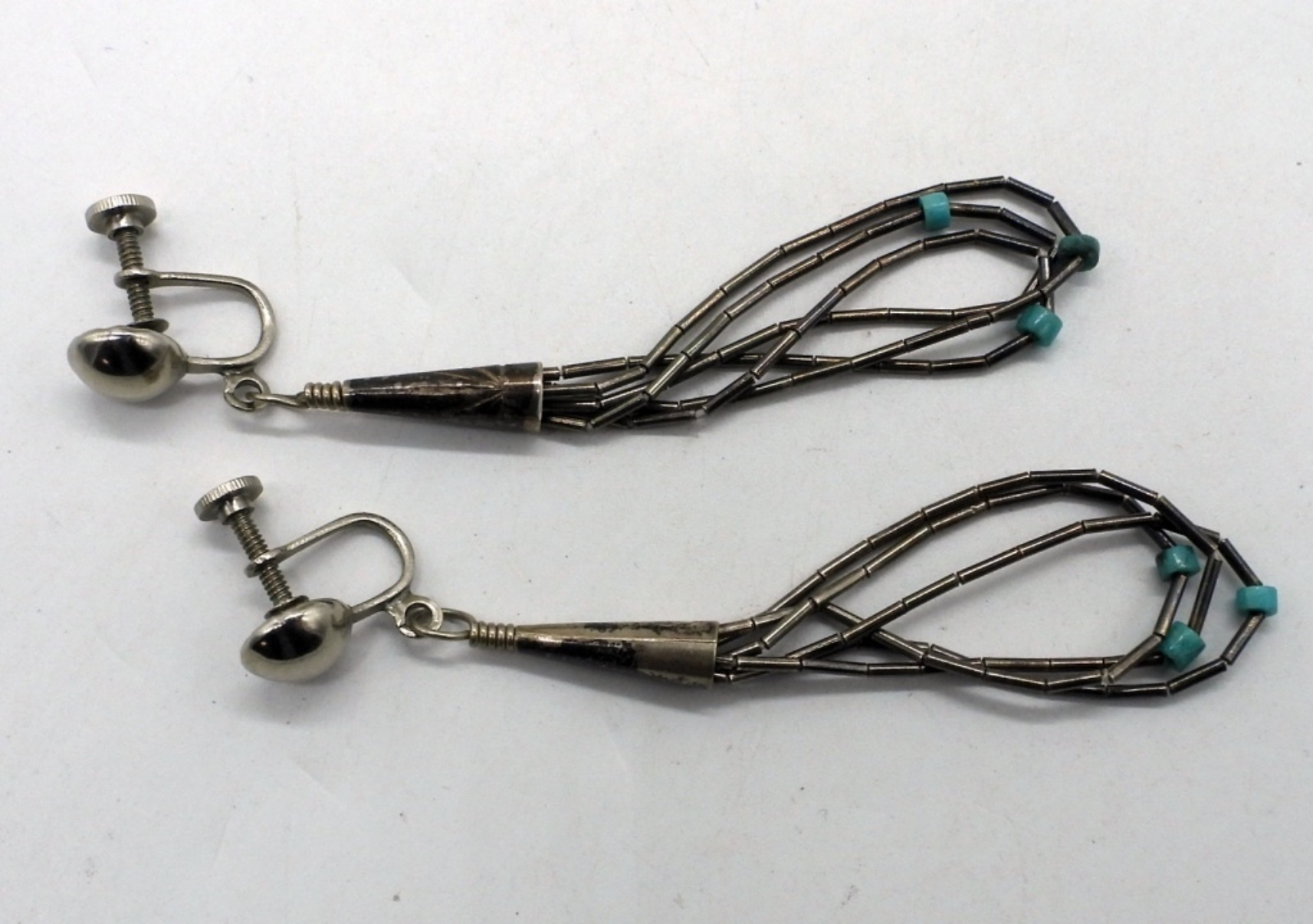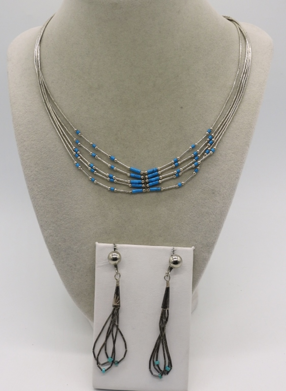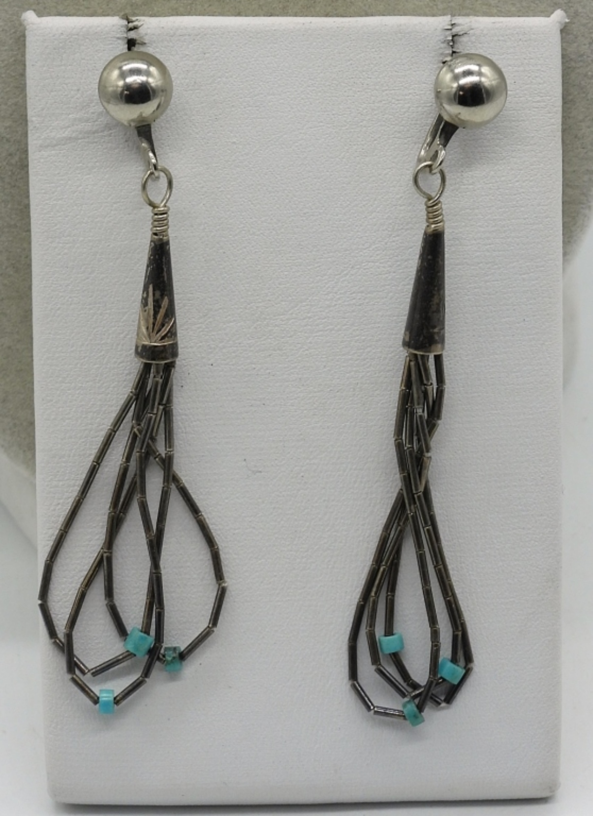 Vintage liquid sterling with turquoise beads. Necklace is 17″ long. Earrings are screw back and 3″ long. (9.9 dwt)