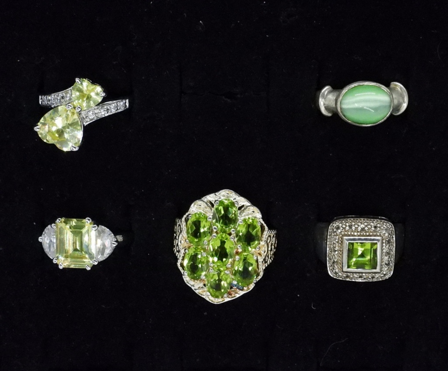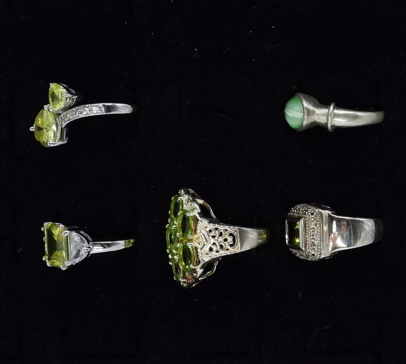 Five sterling rings with peridot and green cats eye gemstones. Sizes are 6, 7 & 9. (16 dwt)