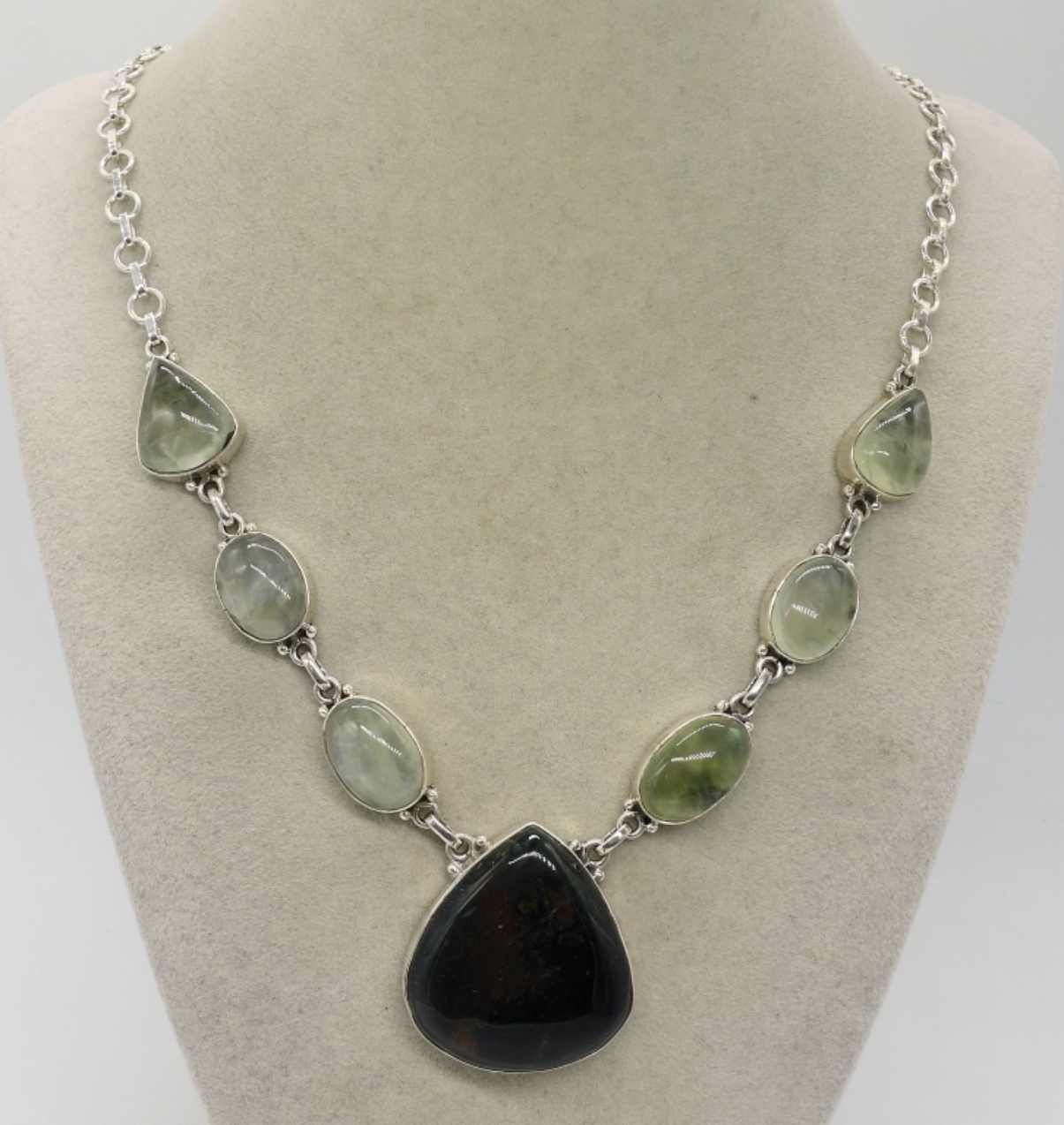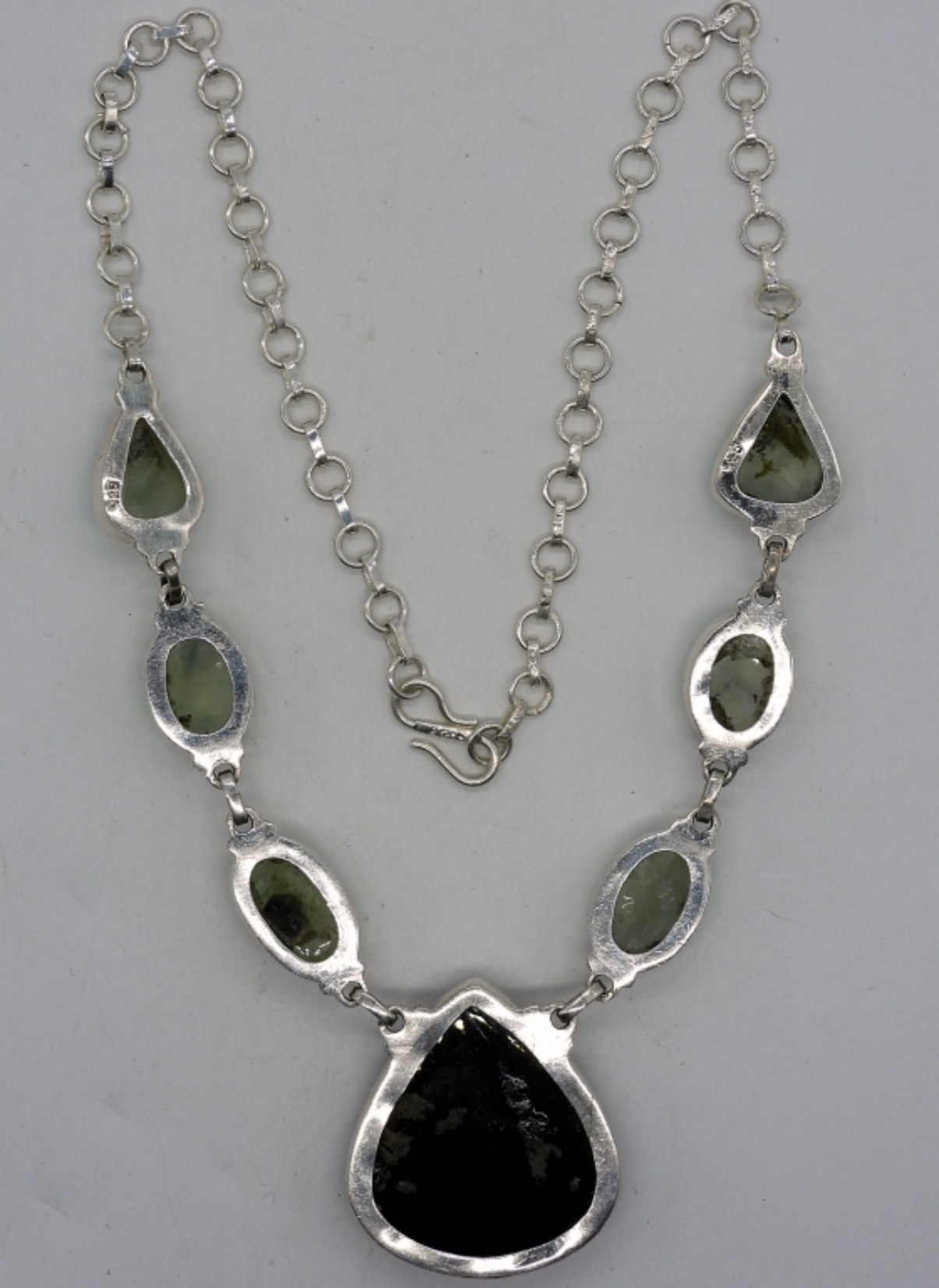 Beautiful sterling necklace with unidentified green gemstones. 20″ long. (15 dwt)