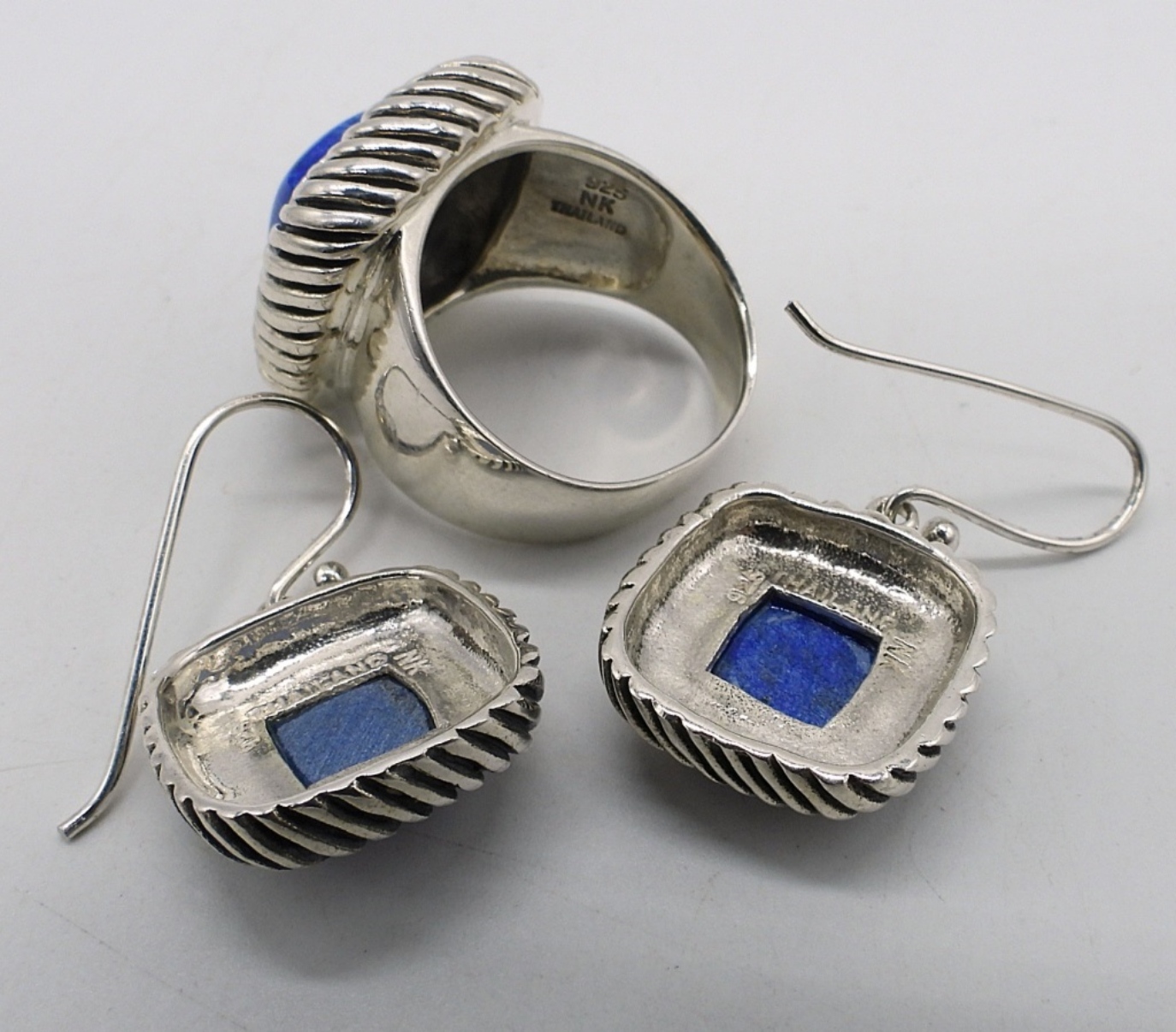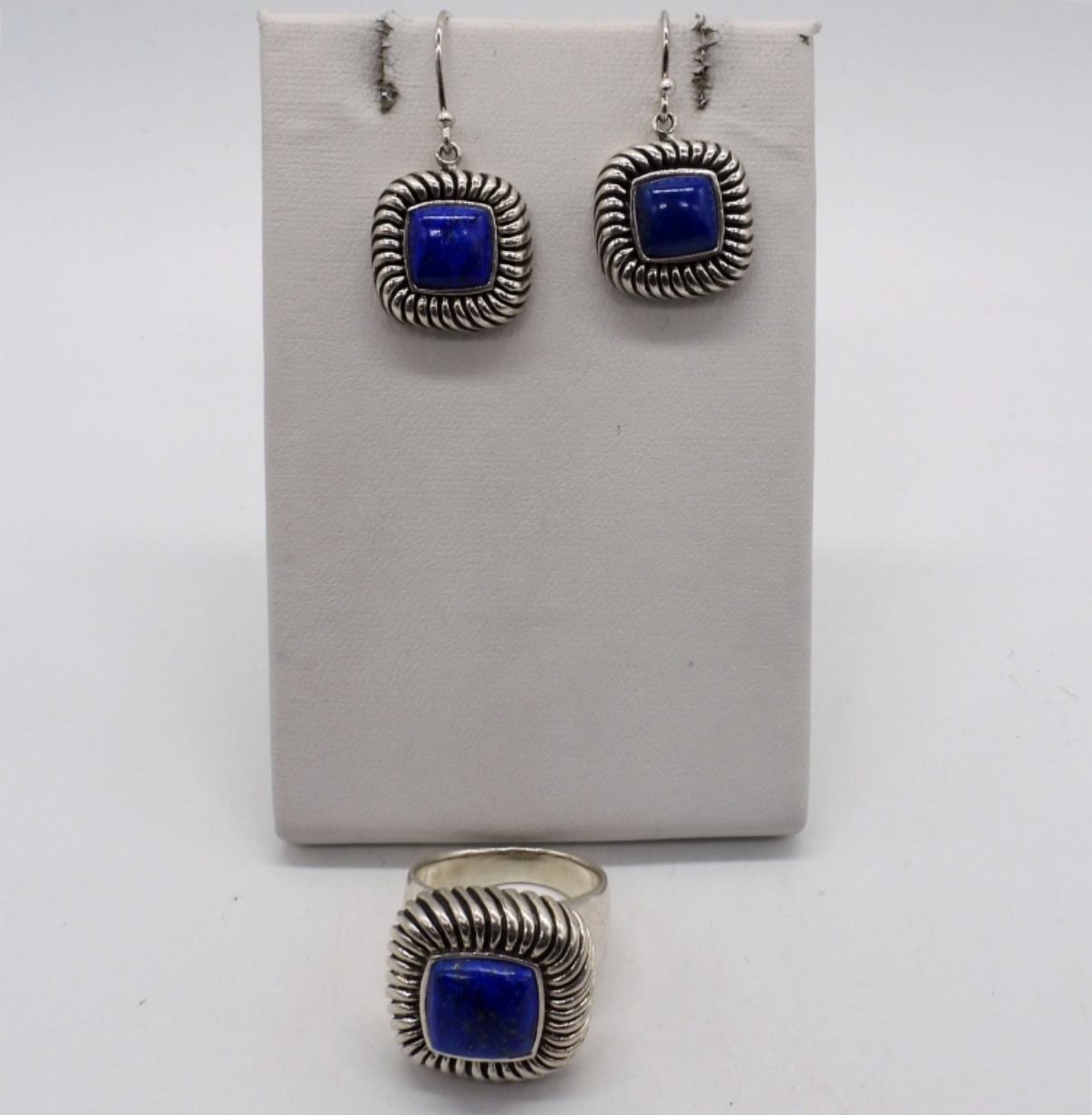 Vintage sterling Lapis Lazuli ring, size 7.5. With matching pierced earrings, 1″ long. (12.5 dwt)