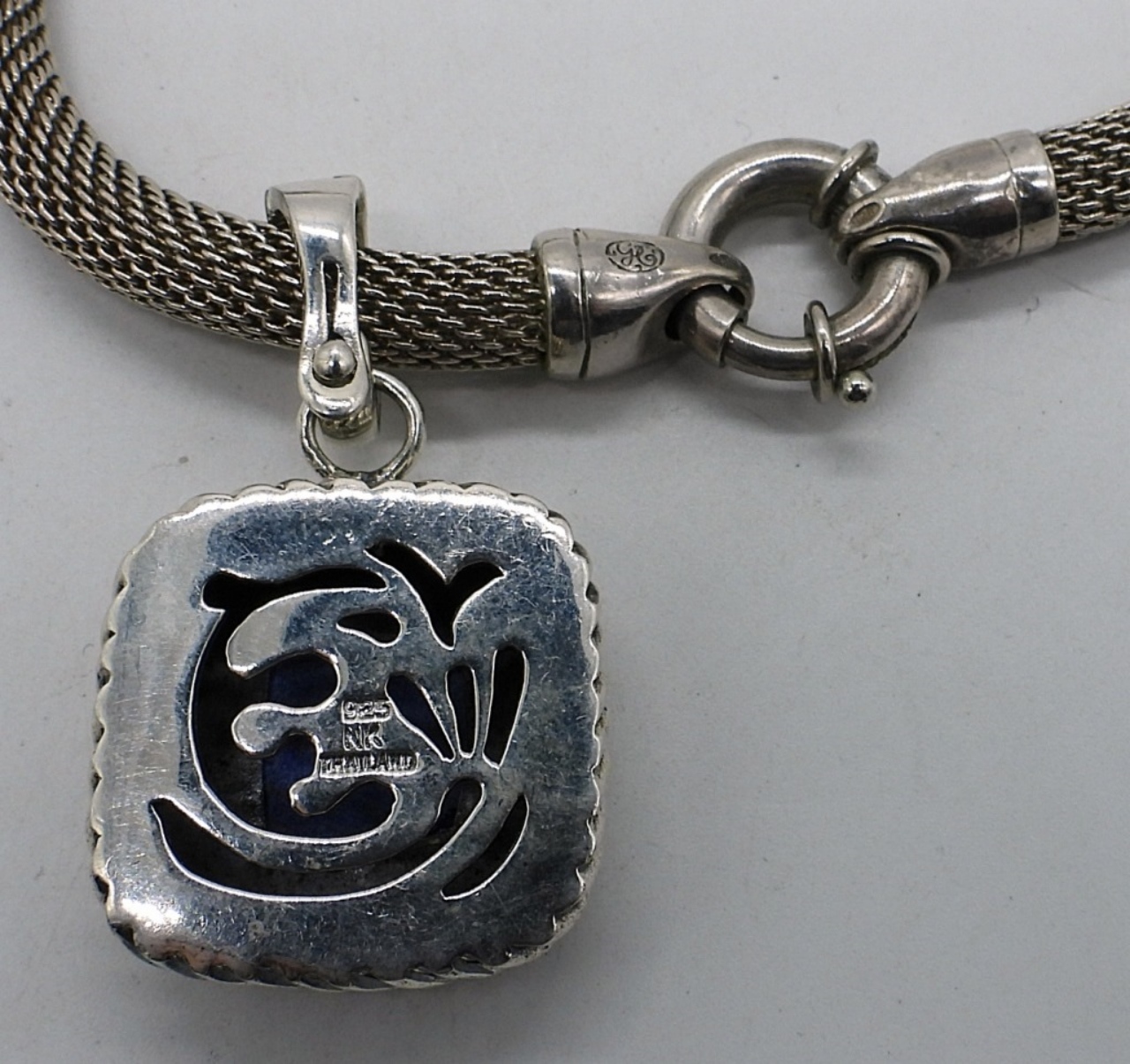 Vintage sterling Lapis Lazuli pendant, marked “925 NK Thailand”. On a sterling mesh chain, 18″ long. (31 dwt)