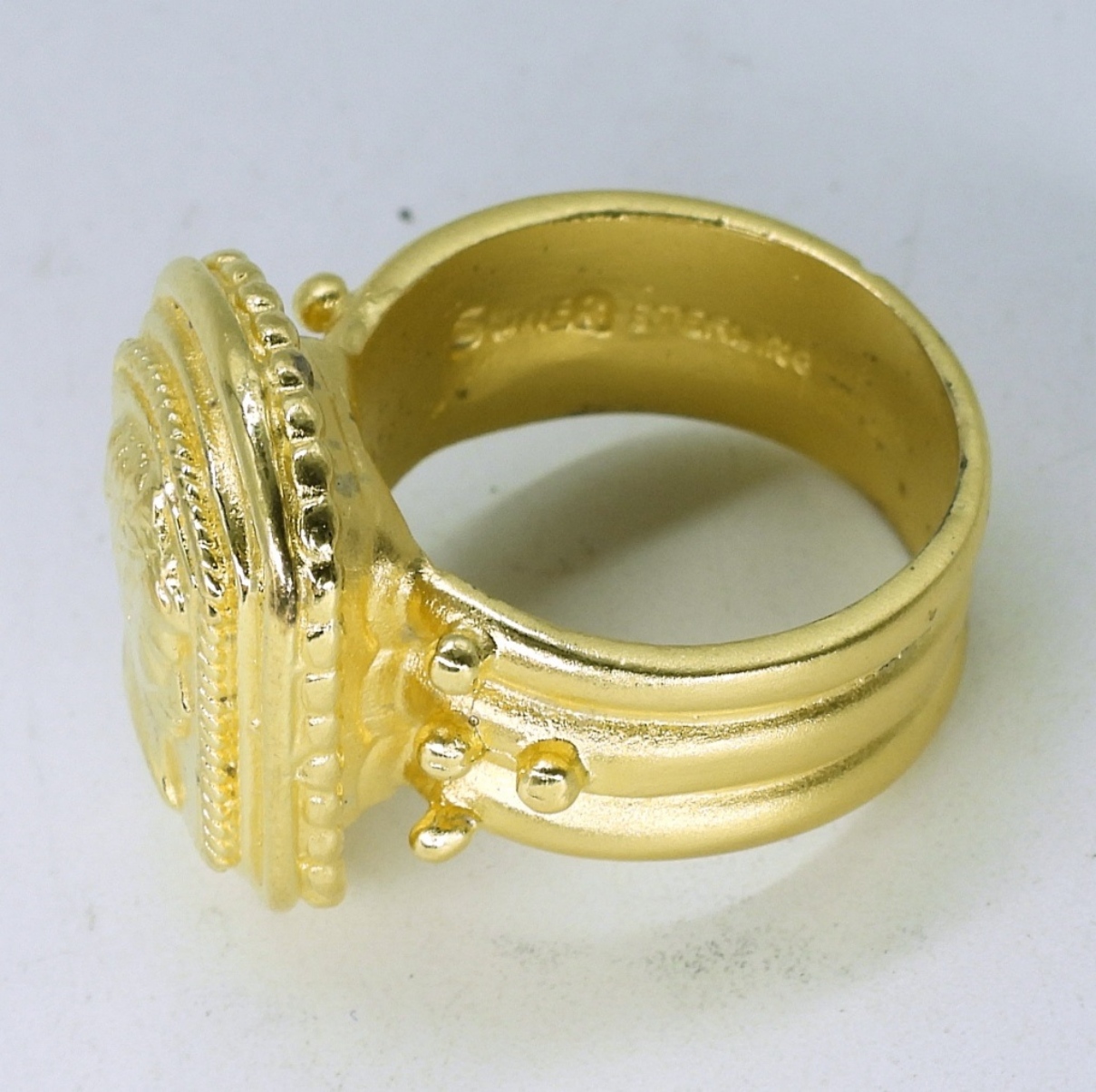 Gold tone ring with matching pierced earrings. Ring is size 6.5. Gold tone sterling bracelet, 8.5″. (31 dwt) 6x4x2