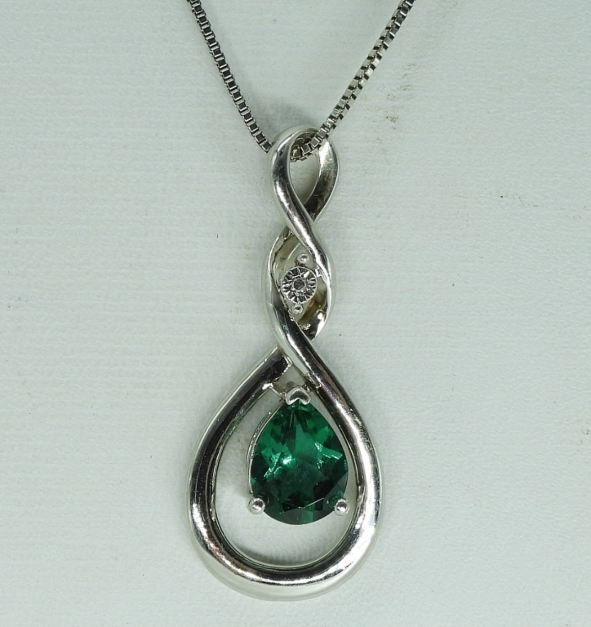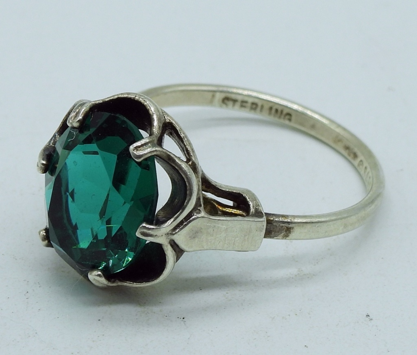 Simulated emerald necklace, 18″ long. Vintage sterling simulated emerald ring, size 8. Sterling marcasite bracelet, 7.5″ long. (18 dwt) (6x4x2)